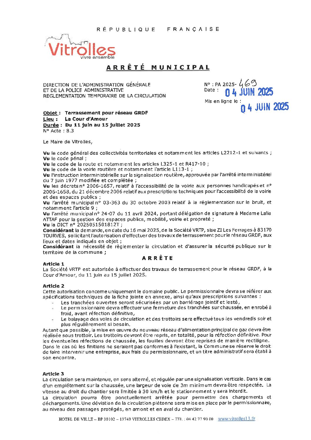 Arrêtés : PA 2025-469 Règlementation temporaire de la circulation – La Cour d Amour