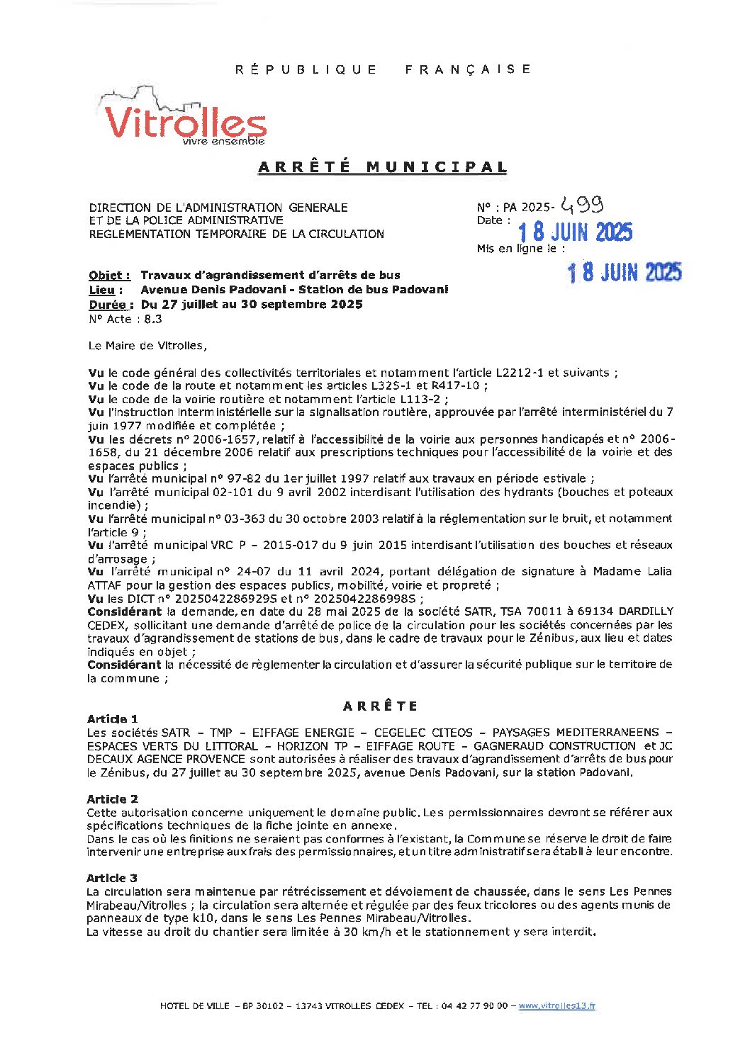 PA 2025-499 Règlementation temporaire de la circulation – Avenue Denis Padovani – Station bus Padovani
