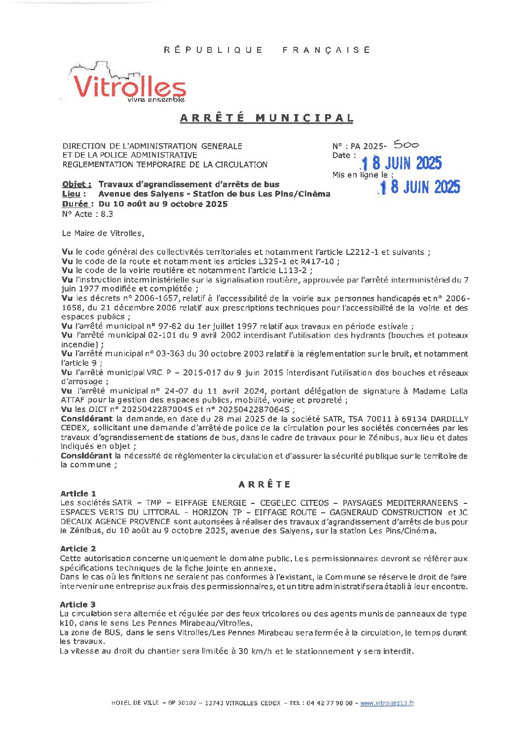 PA 2025-500 Règlementation temporaire de la circulation – Avenue des Salyens – Station bus Les Pins – Cinéma