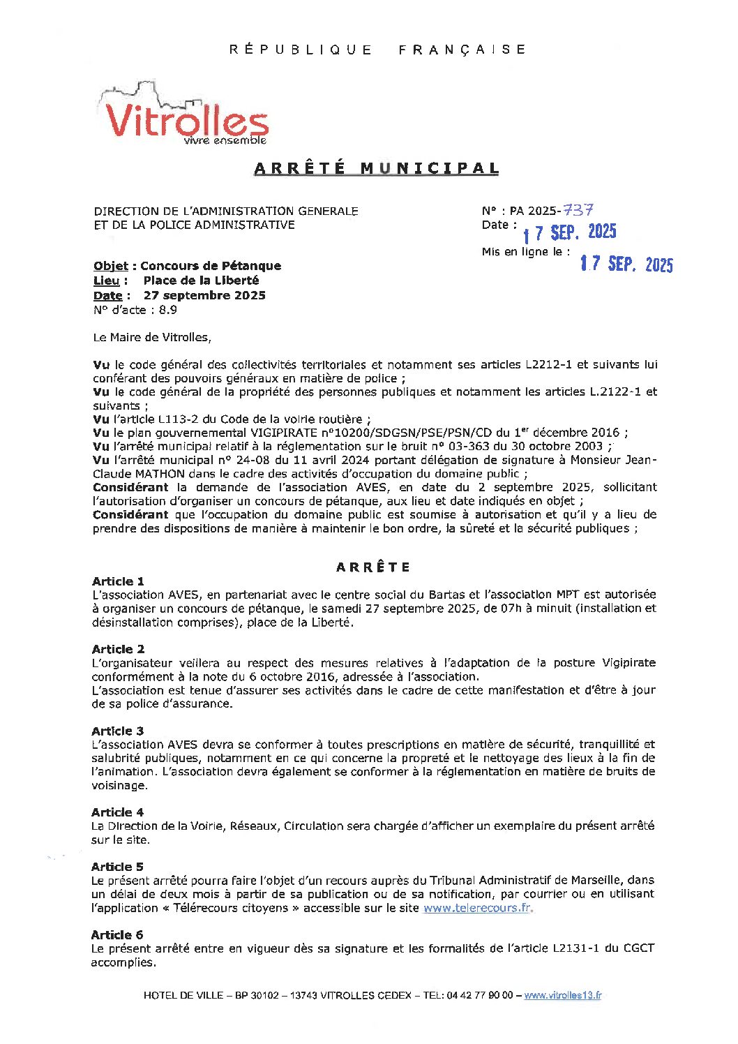Arrêtés : PA 2025-737 AVES Concours de pétanque – Place de la Liberté