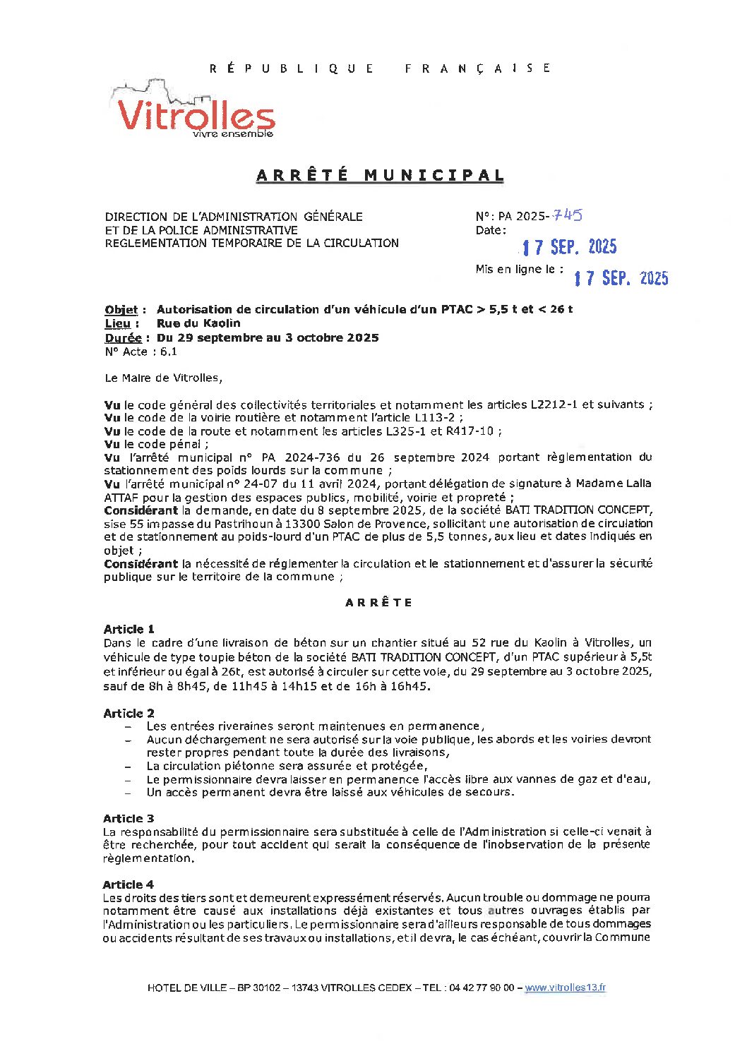 Arrêtés : PA 2025-745 Règlementation temporaire de circulation – Rue du Kaolin