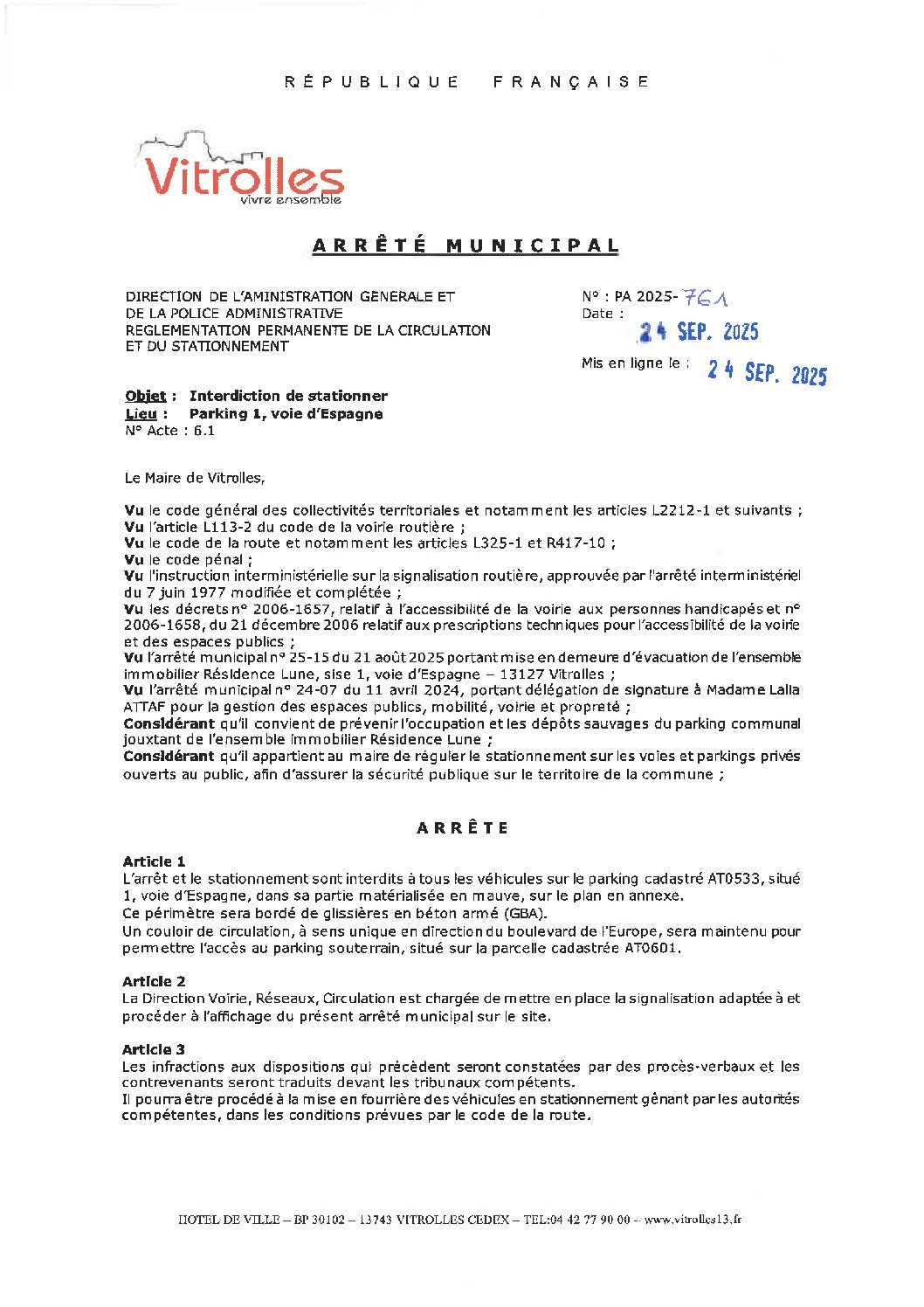 Arrêtés : PA 2025-761 Stationnement interdit – 1 voie d'Espagne