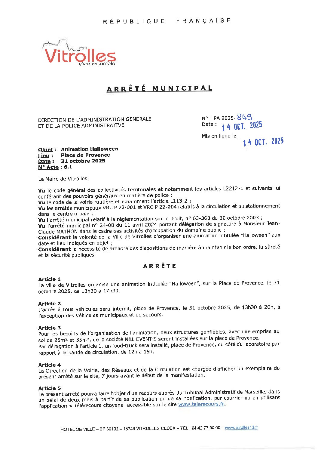 Arrêtés : PA 2025-849 Animation Halloween – Place de Provence