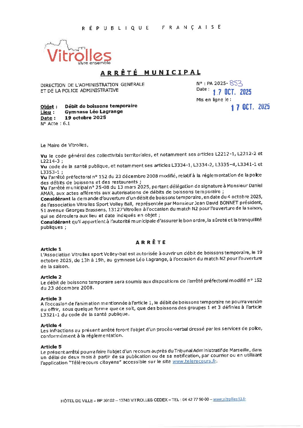 Arrêtés : PA 2025-853 DB Vitrolles Sport Volley Ball – LEO LAGRANGE