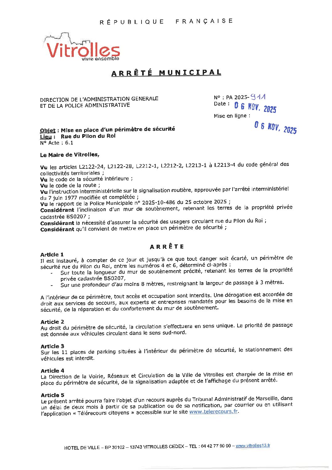 Arrêtés : PA 2025-911 Mise en place d'un périmètre de sécurité – Rue du Pilon du Roi