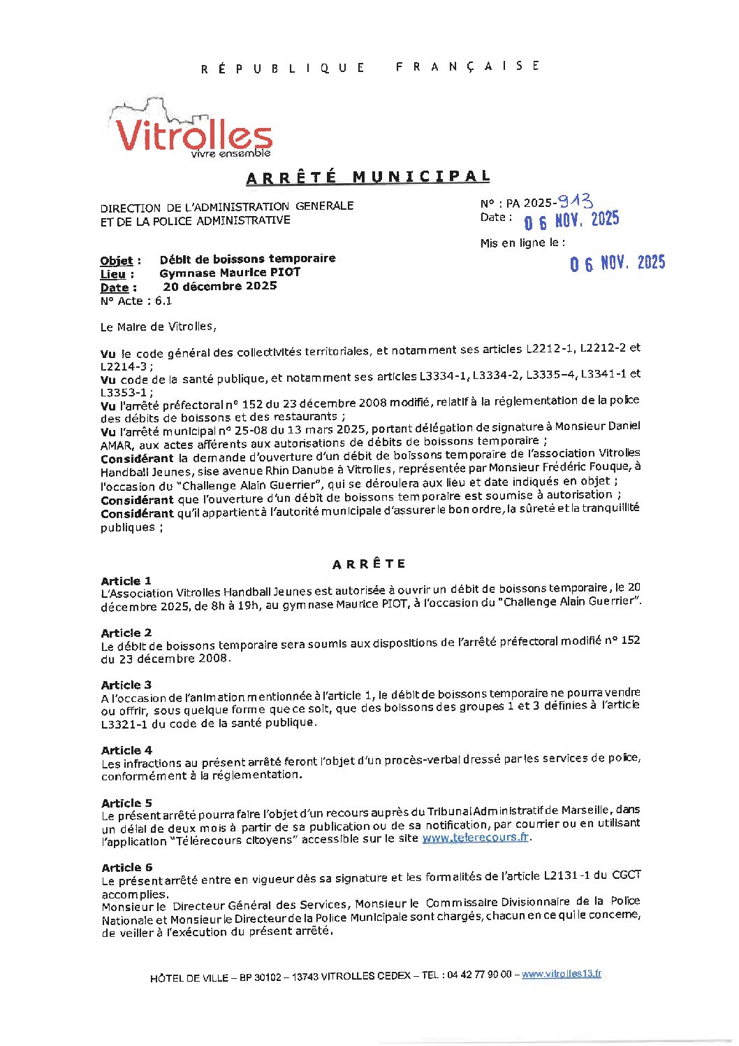 Arrêtés : PA 2025-913 DB Vitrolles Handball – Gymnase Piot