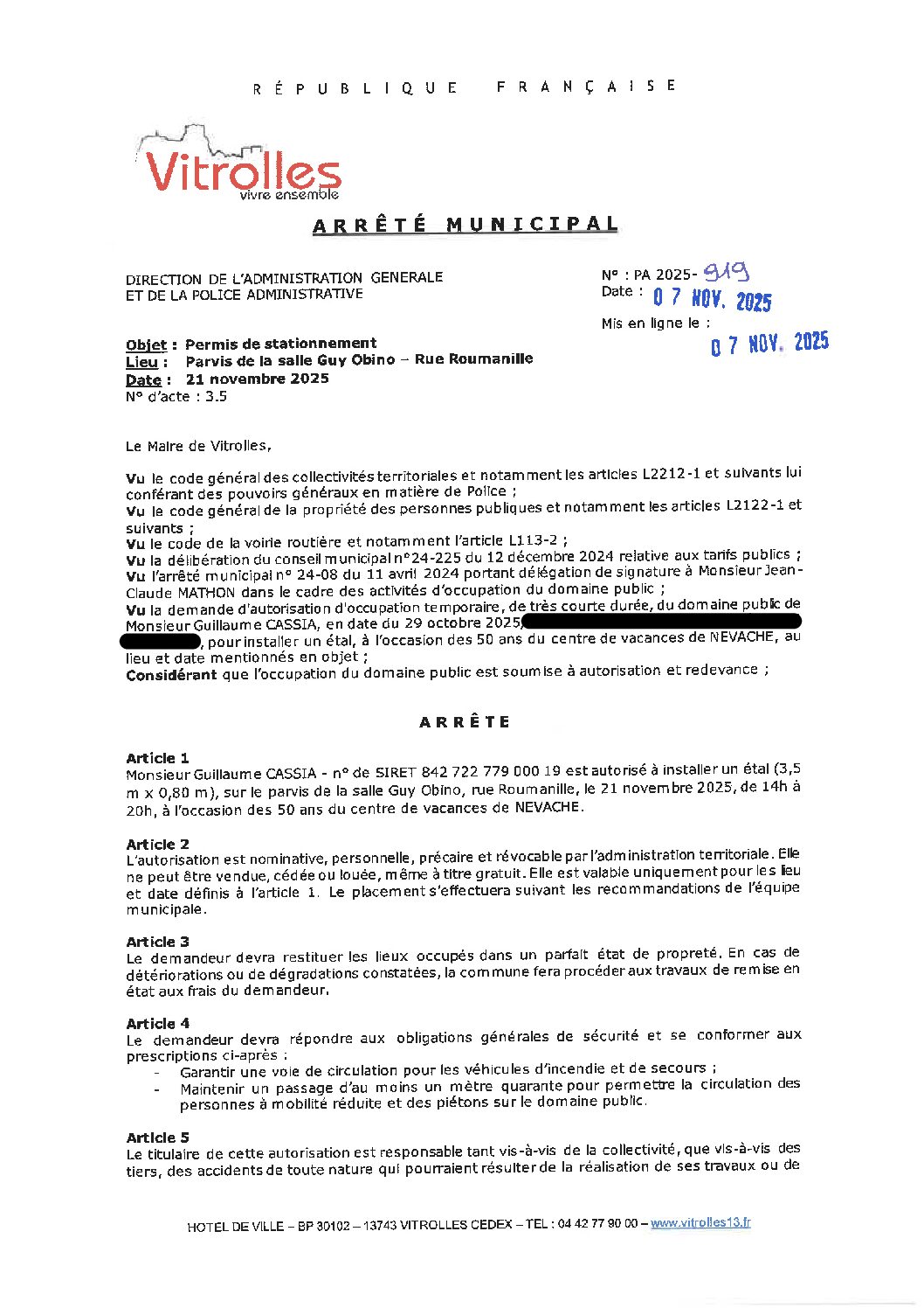 Arrêtés : PA 2025-919 Stand CASSIA – Marrons chauds – 50 ANS NEVACHE