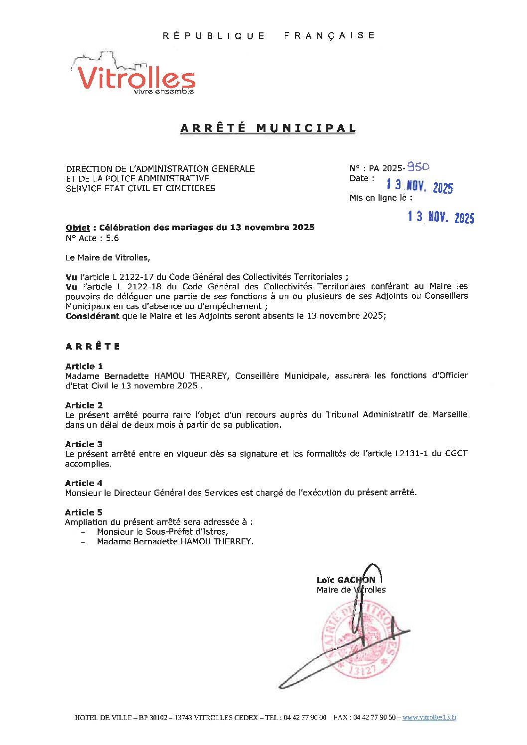 Arrêtés : PA 2025-950 Célébration des mariages du 13 novembre 2025