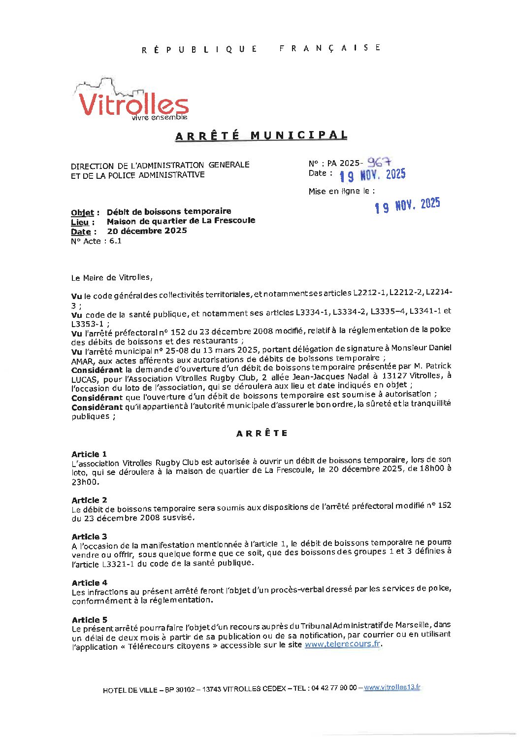 Arrêtés : PA 2025-967 DB Loto Rugby Club Vitrolles