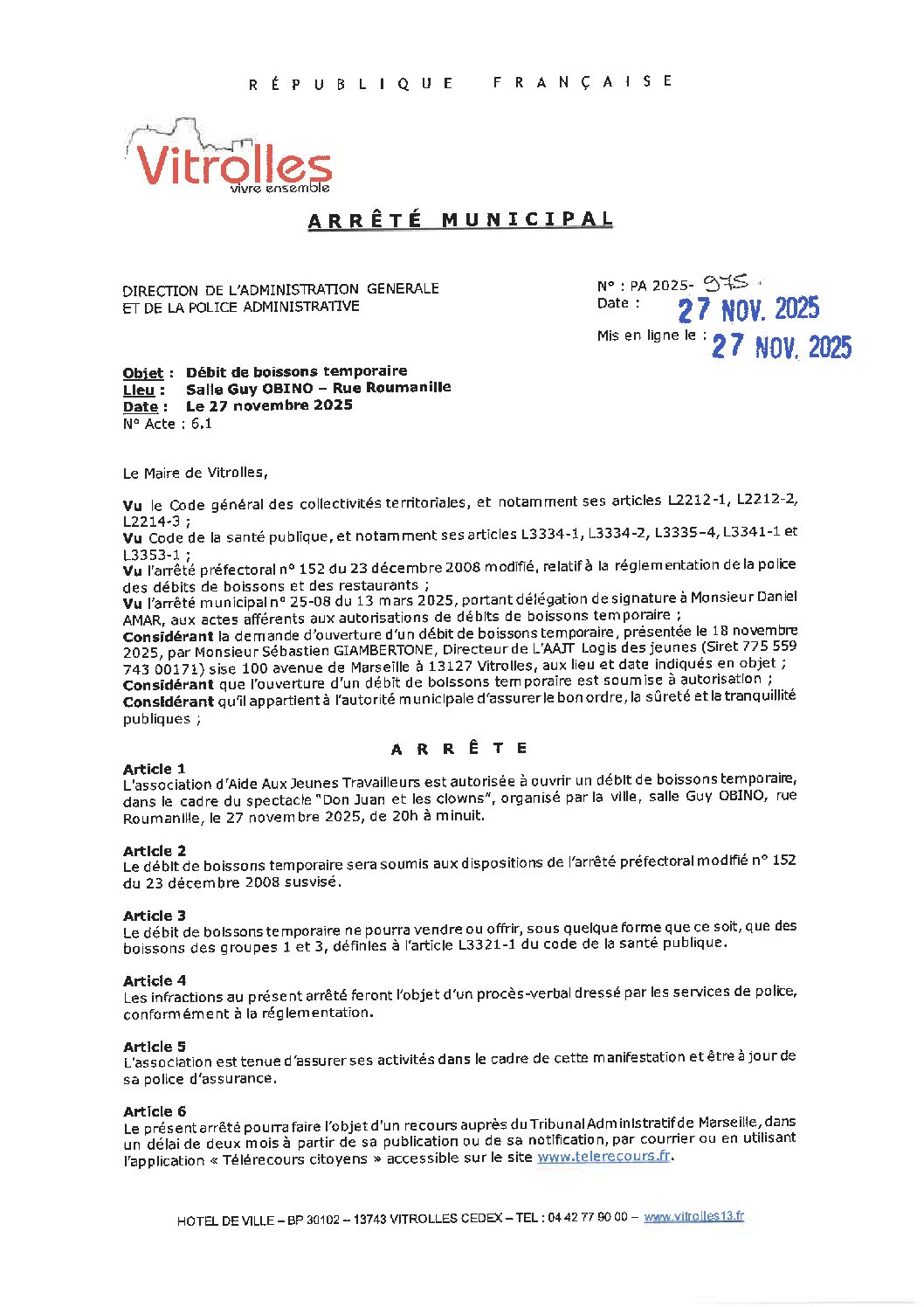 Arrêtés : PA 2025-975 Débit de boisson temporaire – AAJT – Salle Guy Obino