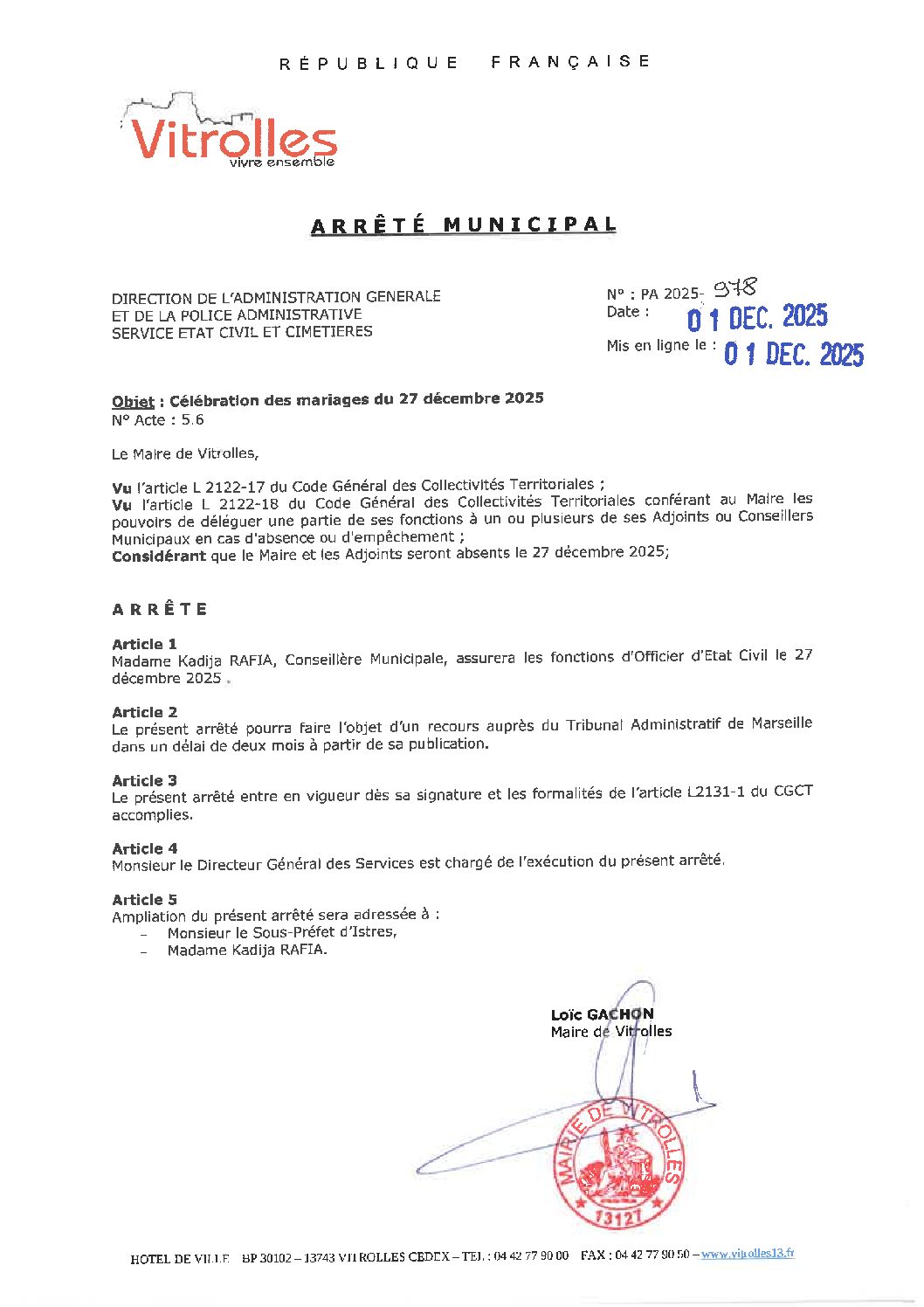 PA 2025-978 Célébration de mariages – Commune de Vitrolles – Le 27 DécembreIntitulé