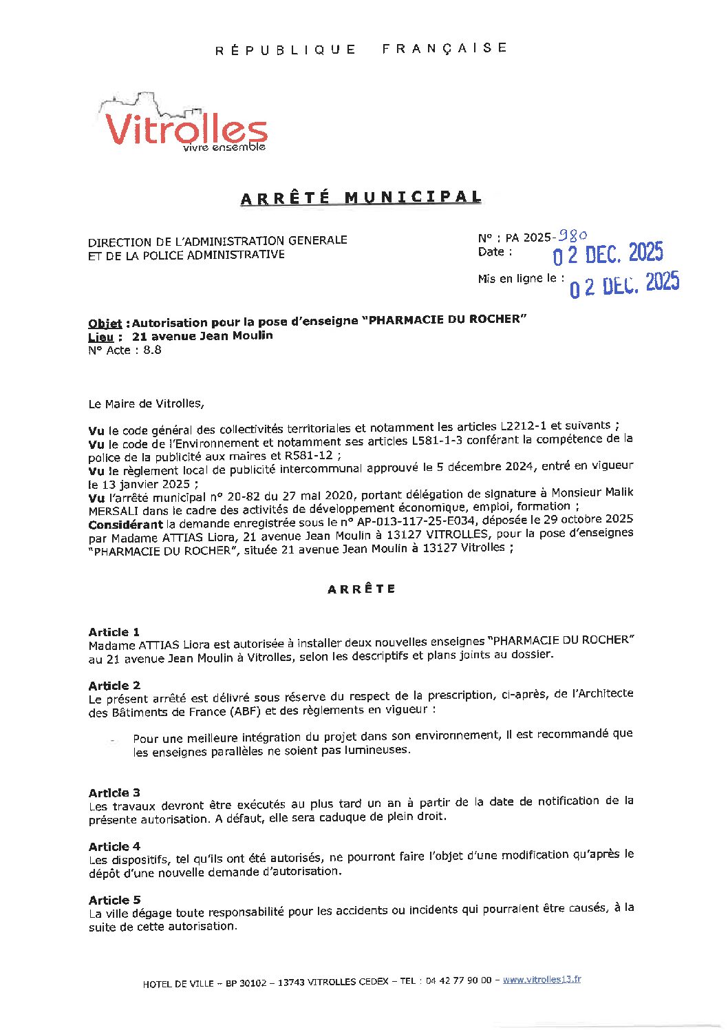 PA 2025-980 PHARMACIE DU ROCHER pose enseigne avis favorable avec prescription ABF