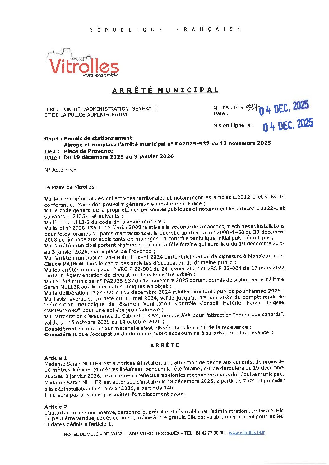 Arrêtés : PA 2025-997 Abrogation du PA 2025-937