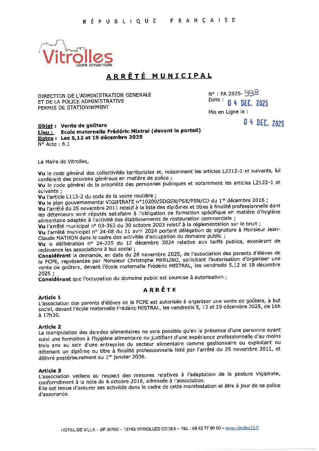 Arrêtés : PA 2025-998 Asso FCPE – Ecole MISTRAL