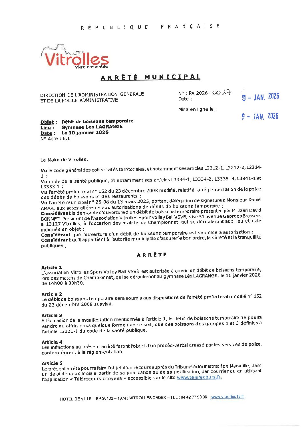 PA 2026-0017 Débit de boissons – Vitrolles Volley Ball – Gymnase Léo LAGRANGE le 10-01-2026
