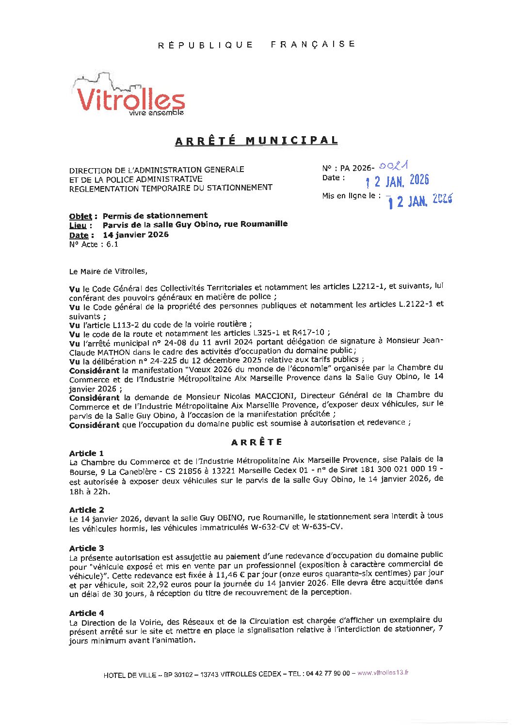 PA 2026-0021 CCI Métropolitaine Aix Marseille Provence – Permis de stationnement Obino
