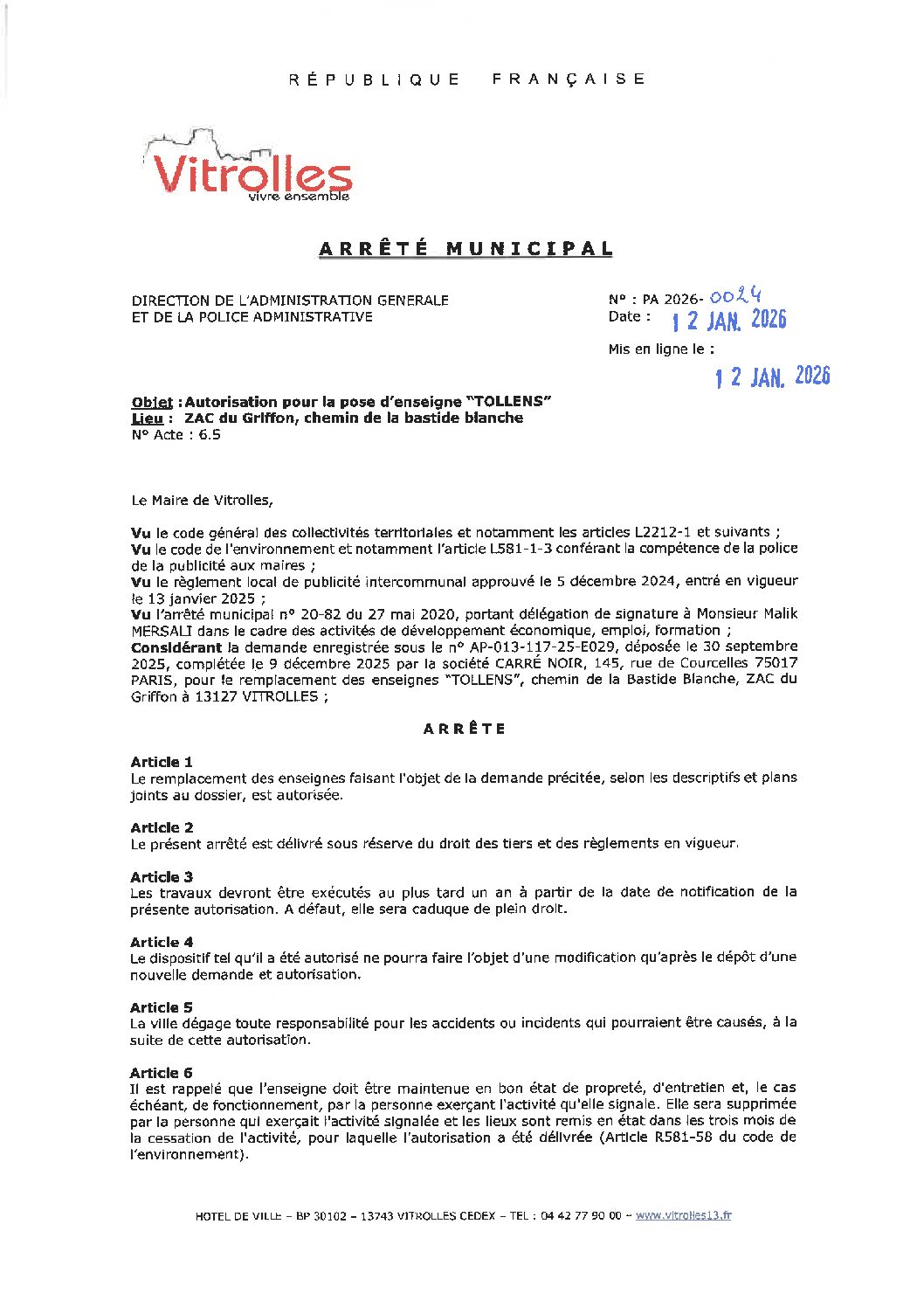Arrêtés : PA 2026-0024 Autorisation enseigne TOLLENS