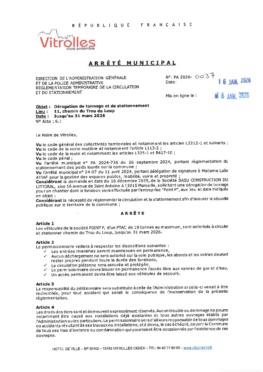 PA 2026-0037 Réglementation de la circulation et du stationement- 11 chemin du trou du loup