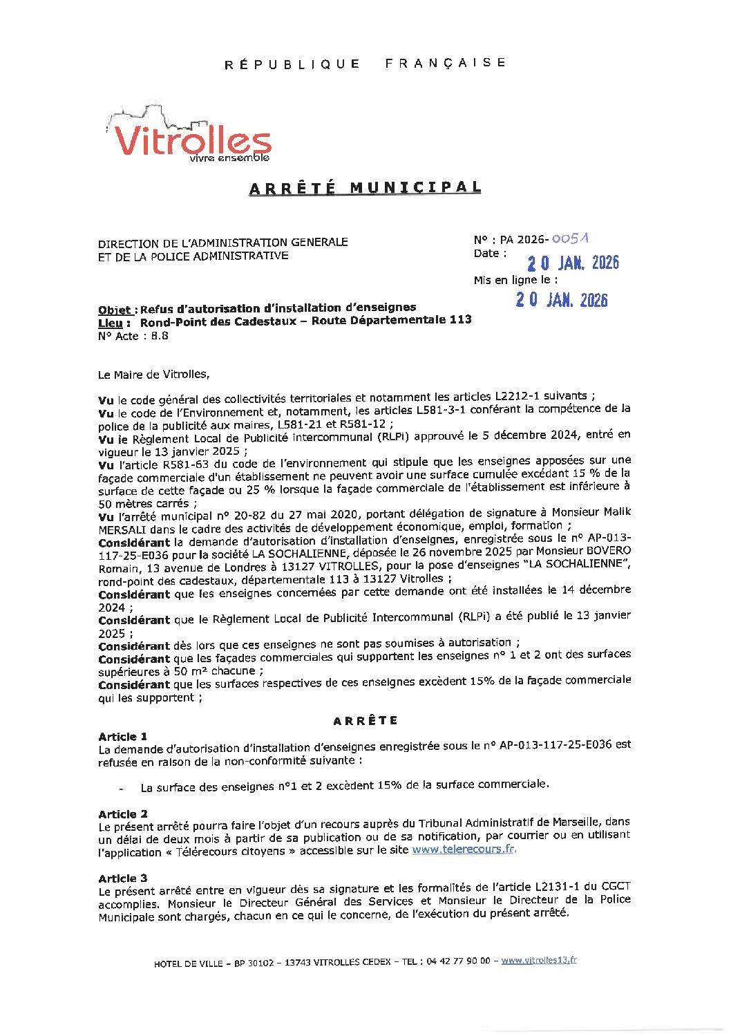 Arrêtés : PA 2026-0051 Avis défavorable pose enseigne LA SOCHALIENNE