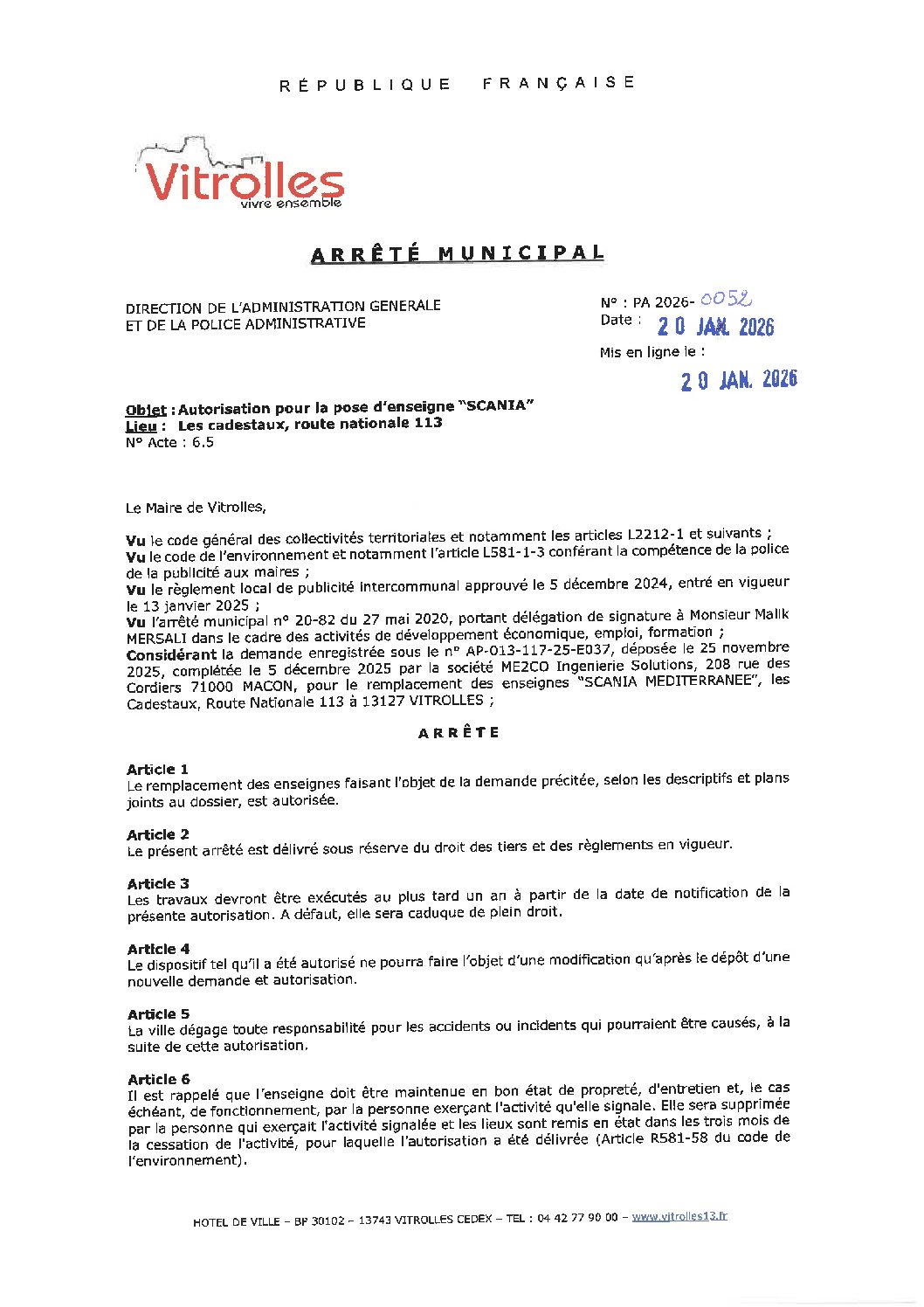 Arrêtés : PA 2026-0052 Autorisation enseigne SCANIA