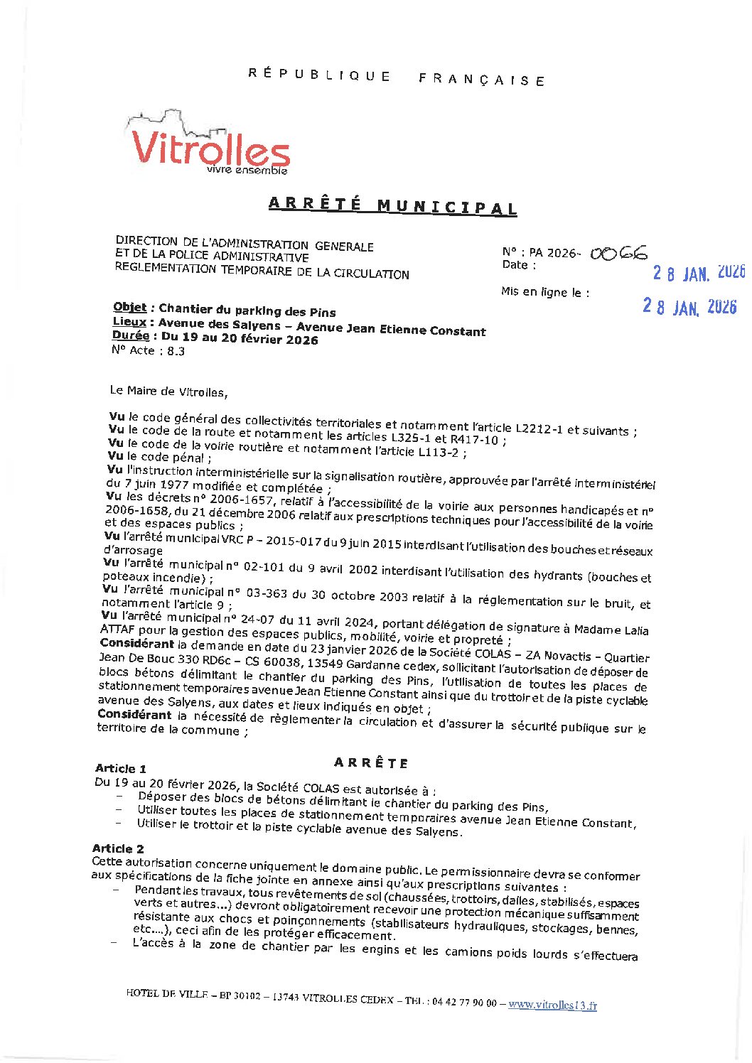 PA 2026-0066 Règlementation temporaire de la circulation – Avenue des Salyens et avenue Jean Etienne CONSTANT