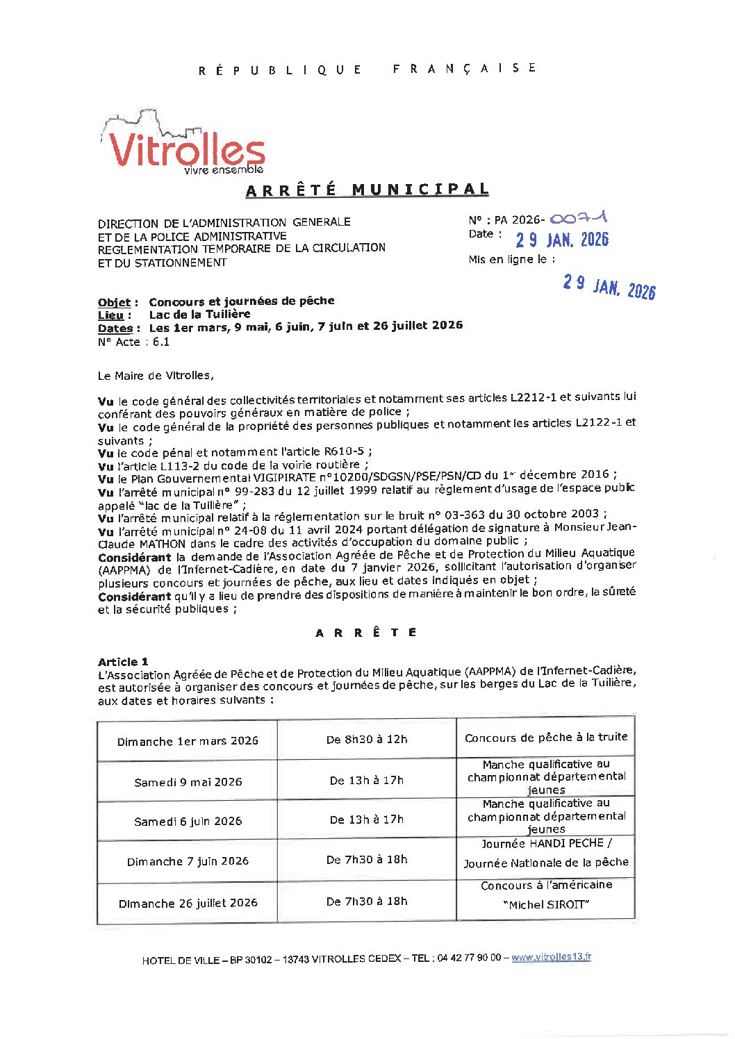Arrêtés : PA 2026-0071 Concours de pêche – Lac de la Tuilière – AAPPMA