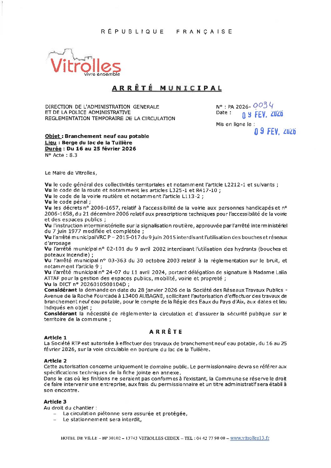 PA 2026-0094 Règlementation temporaire de la circulation – Berge du lac de la Tuilière