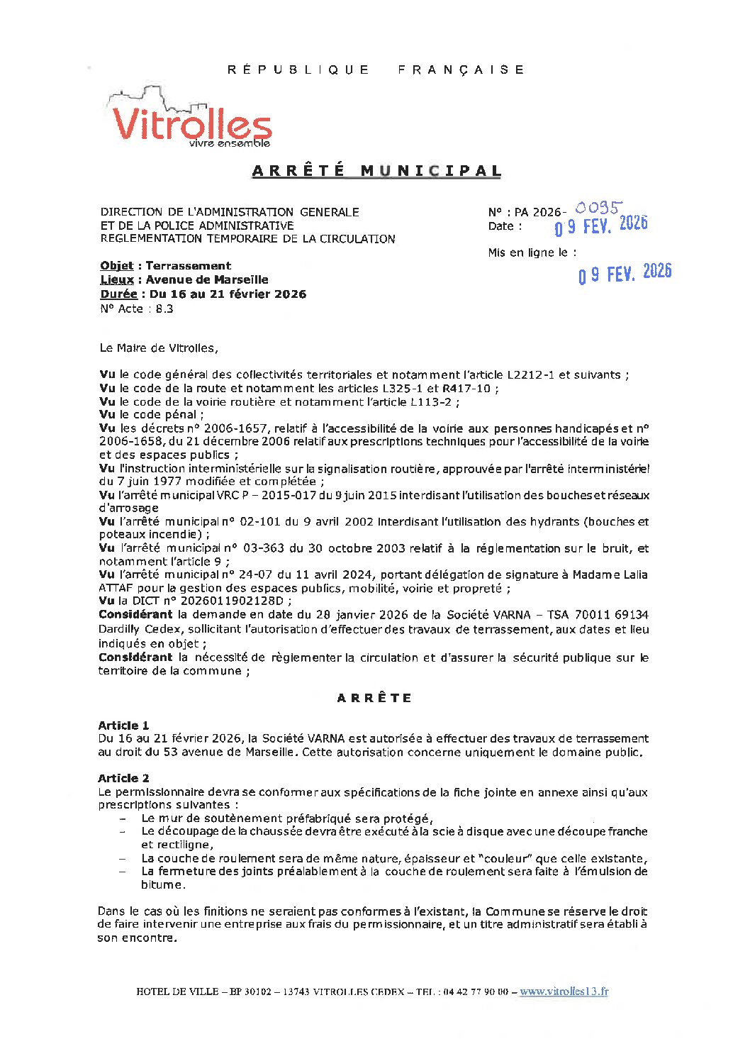 PA 2026-0095 Règlementation temporaire de la circulation – Avenue de Marseille