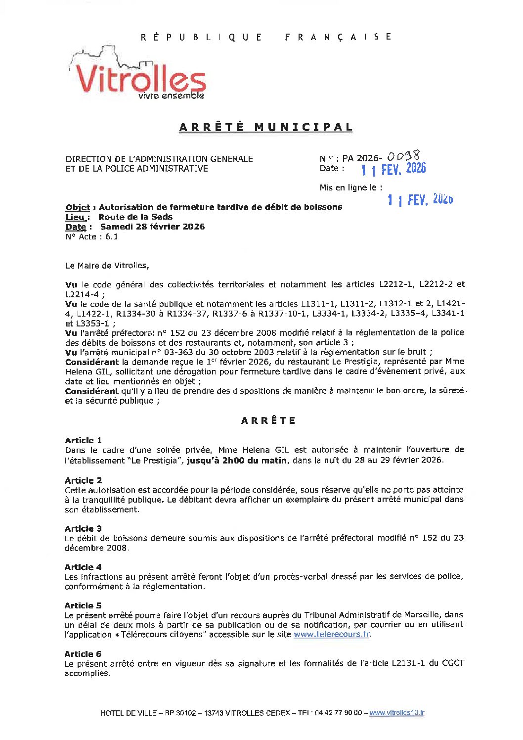 PA 2026-0098 Autorisation de fermeture tardive de débit de boissons – Le Prestigia – samedi 28 février 2026