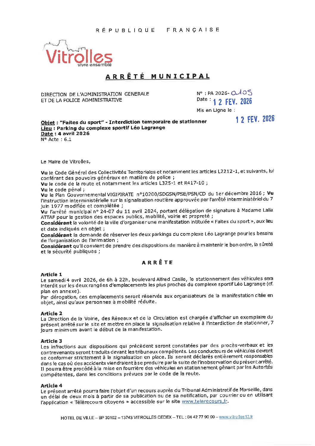 Arrêtés : PA 2026-0105 Faites du sport – Interdiction temporaire de stationner – Parking Complexe Léo Lagrange