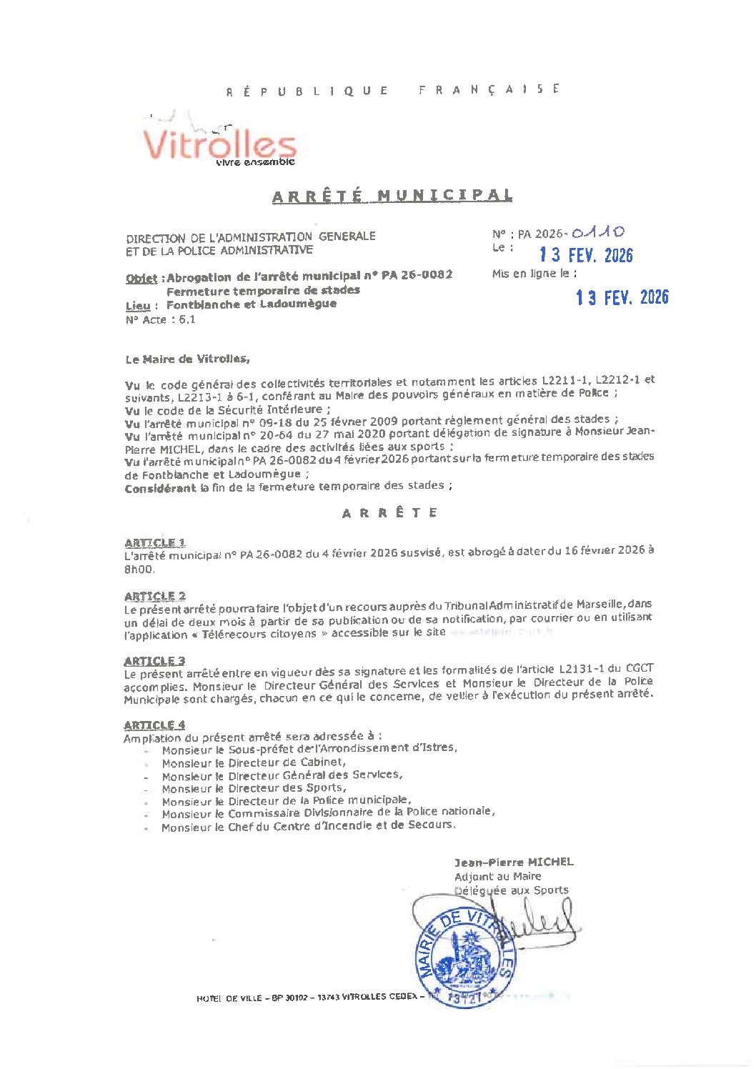 Arrêtés : PA 2026-0110 Abrogation PA26-0082 – Fermeture temporaire des stades Fontblanche et Ladoumègue
