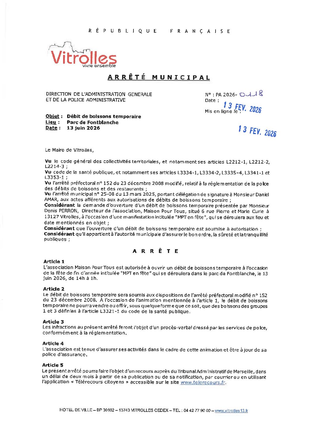 Arrêtés : PA 2026-0118 Débit de boissons temporaire MPT en fête – Fontblanche