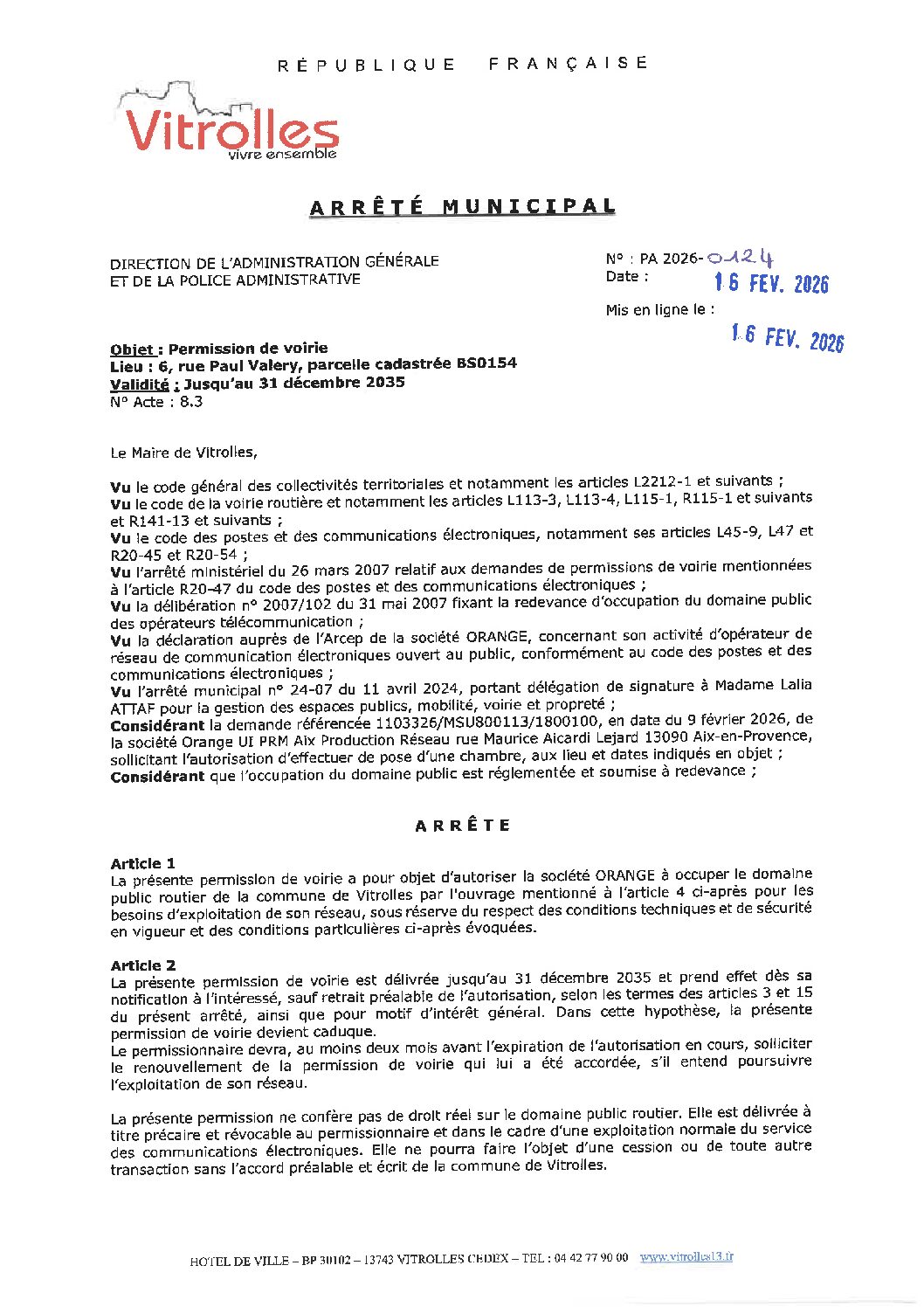 Arrêtés : PA 2026-0124 Permission de voirie ORANGE