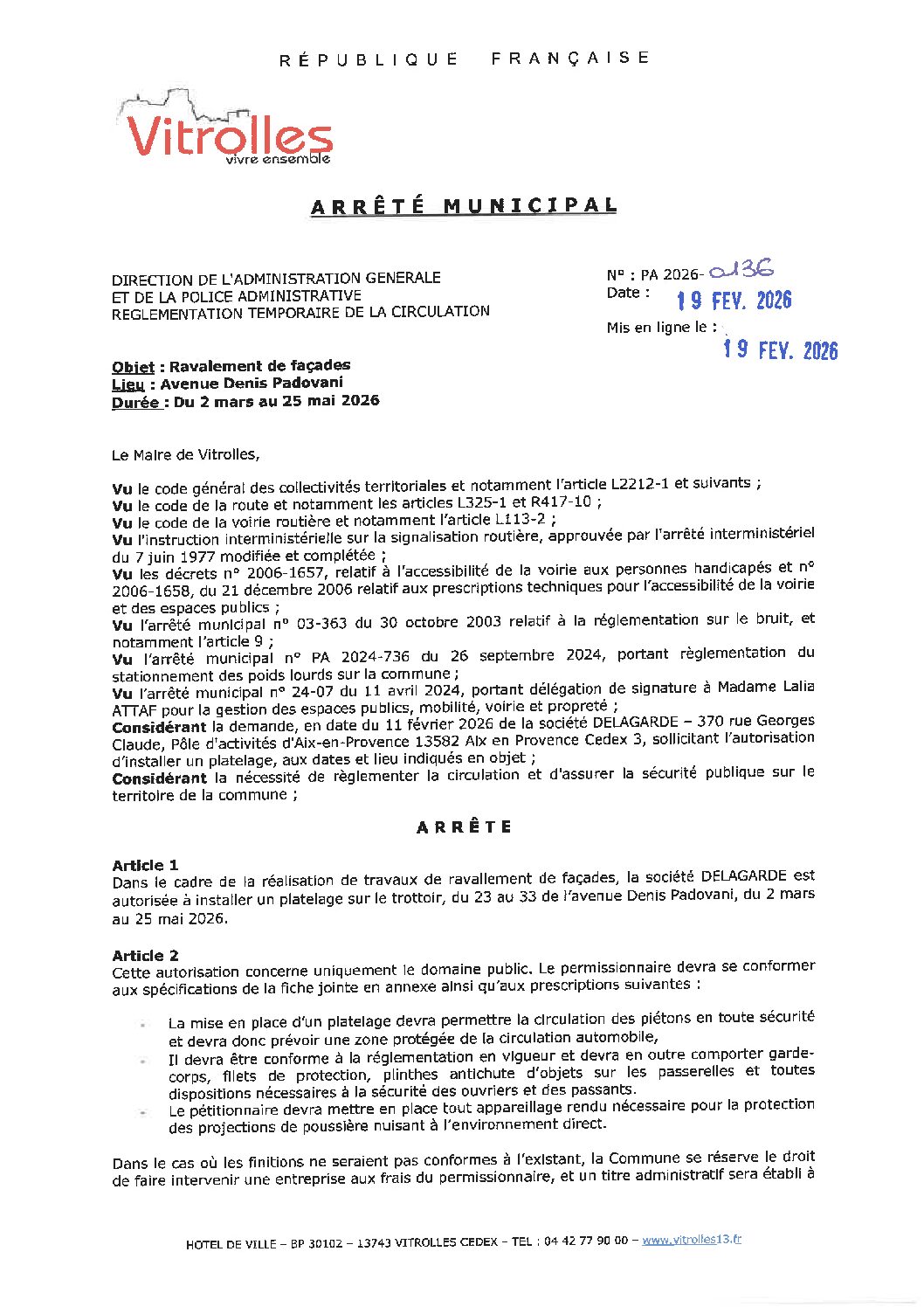 Arrêtés : PA 2026-0136 Ravalement de façades – Avenue Denis Padovani