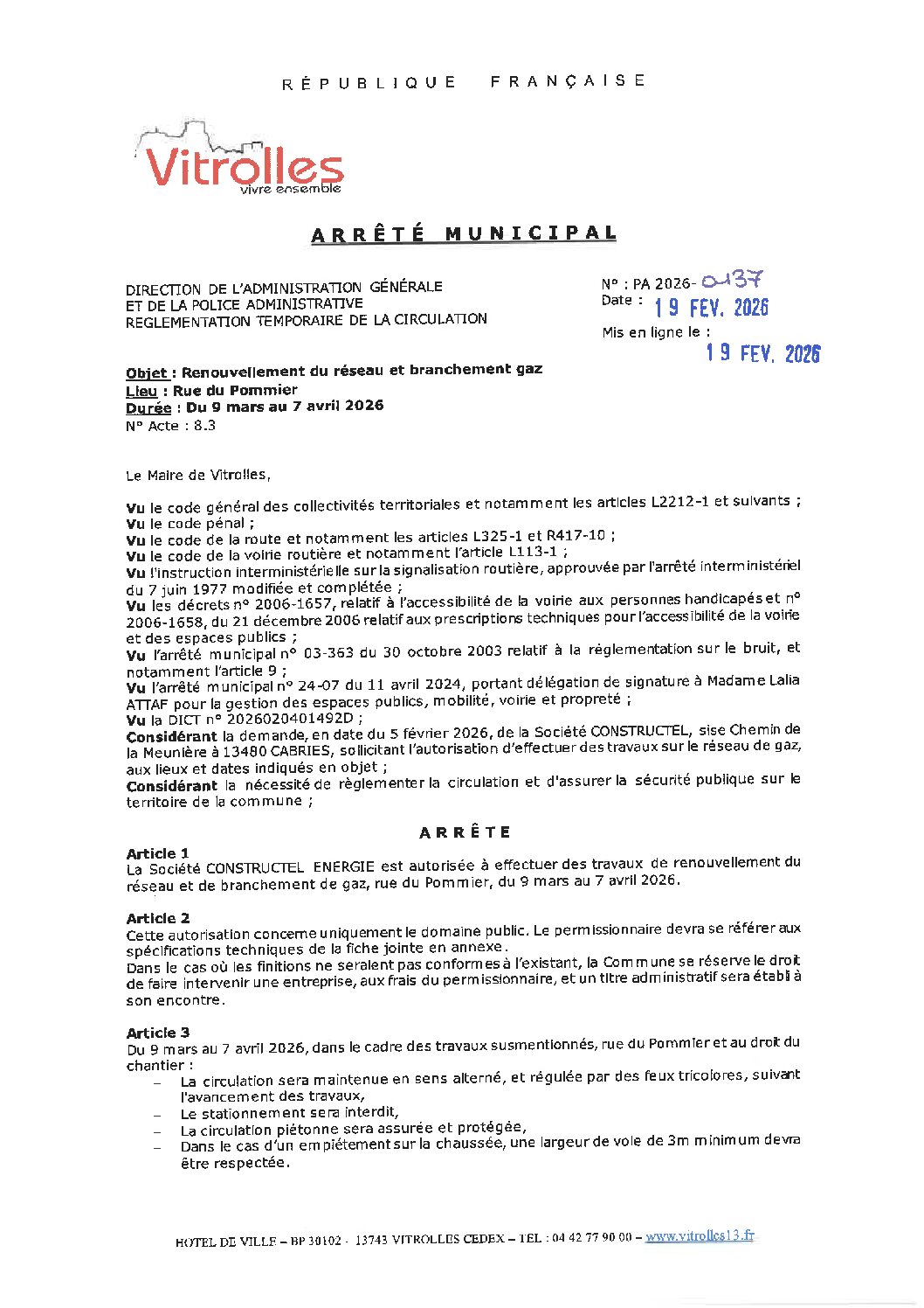Arrêtés : PA 2026-0137 Renouvellement réseau et branchement gaz – Rue du Pommier