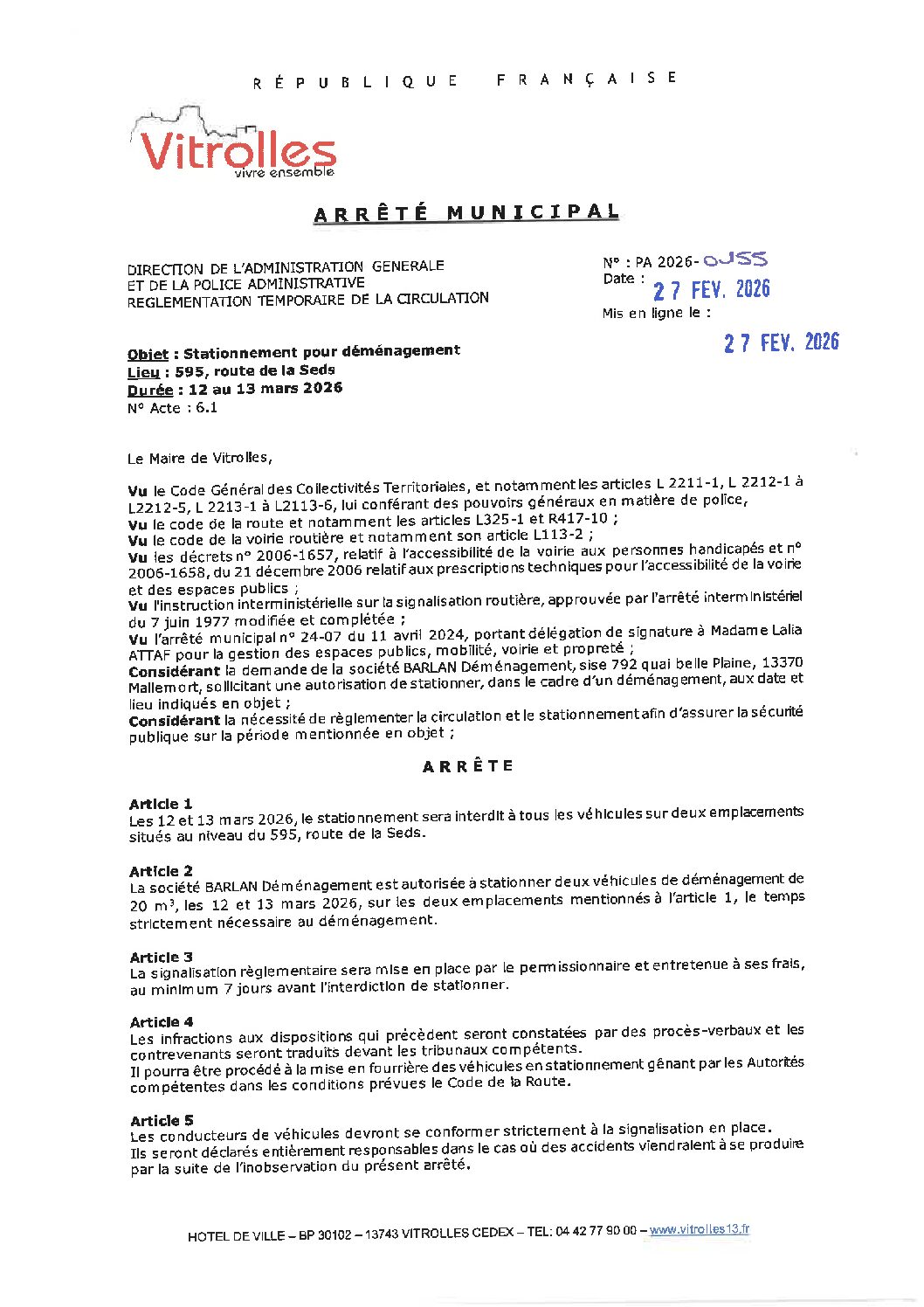 Arrêtés : PA 2026-0155 Stationnement pour déménagement – Route de la Seds