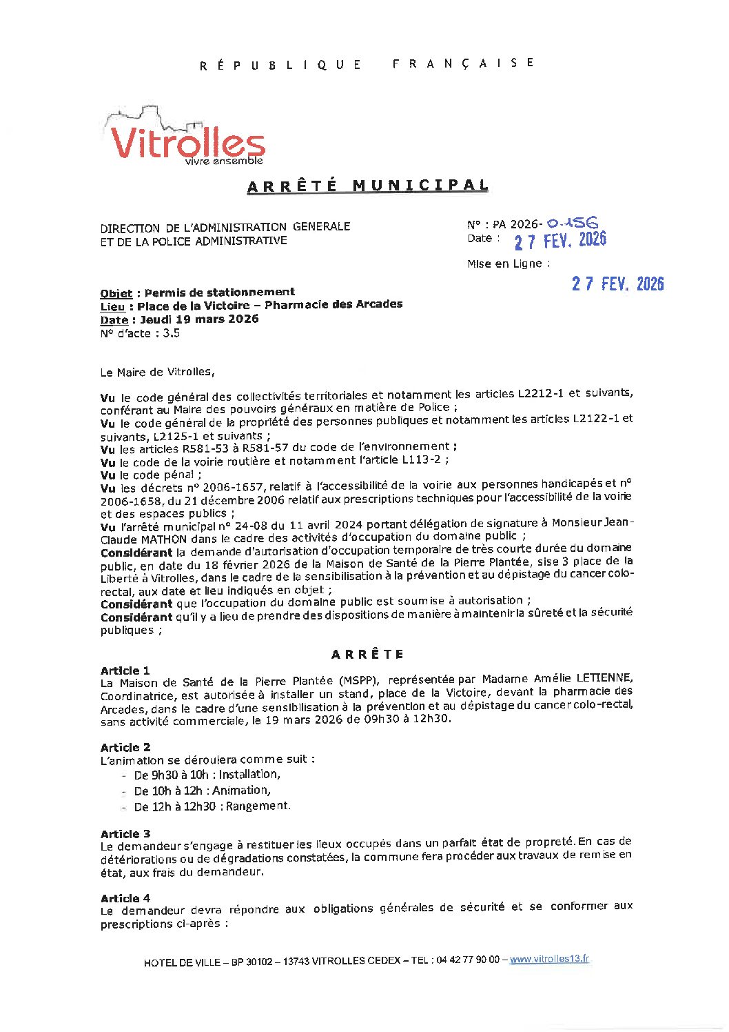 Arrêtés : PA 2026-0156 Permis de stationnement – Manifestation MARS BLEU
