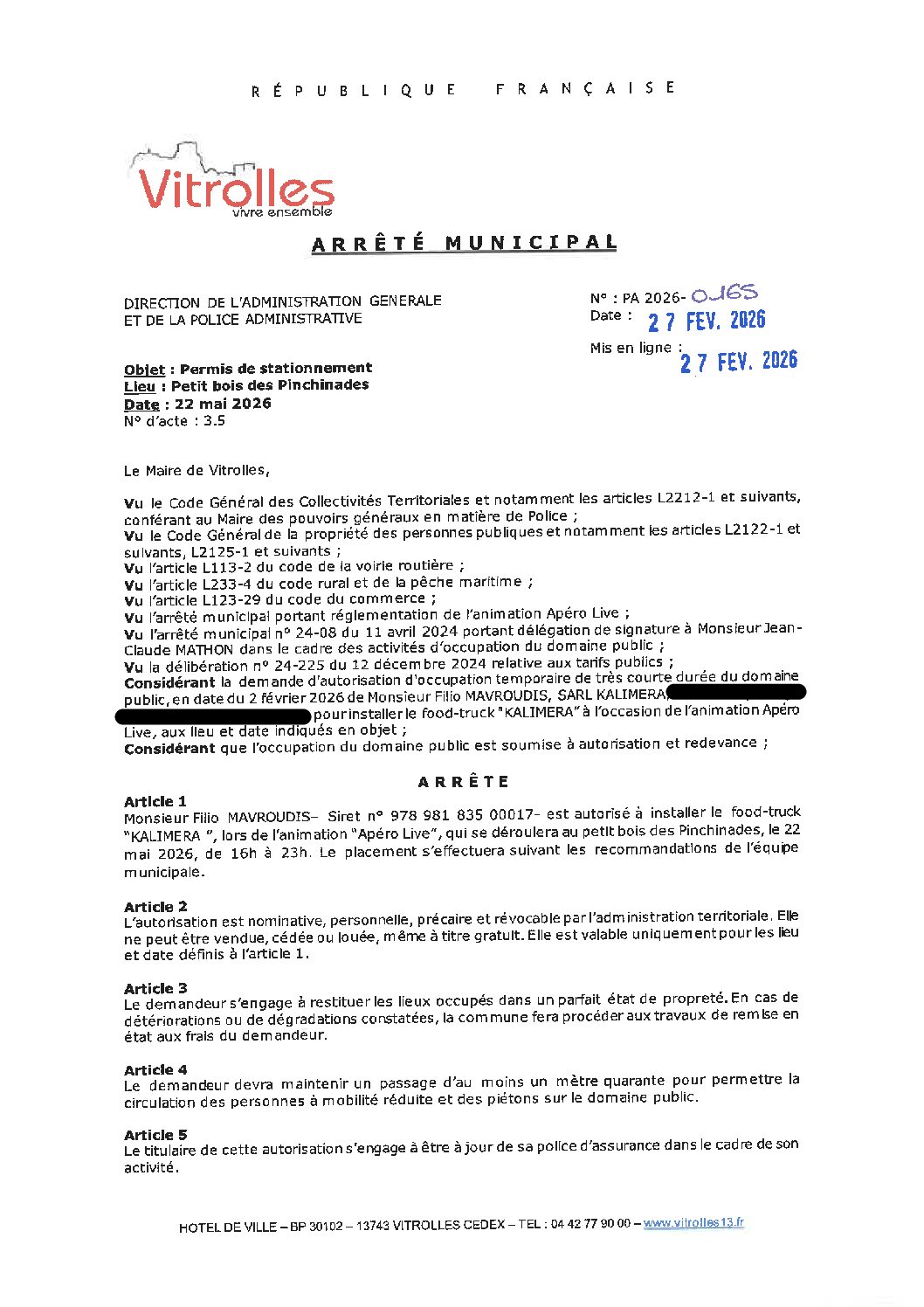 Arrêtés : PA 2026-0165 KALIMERA – Apéro Live – Petit bois des Pinchinades – 22 mai 2026