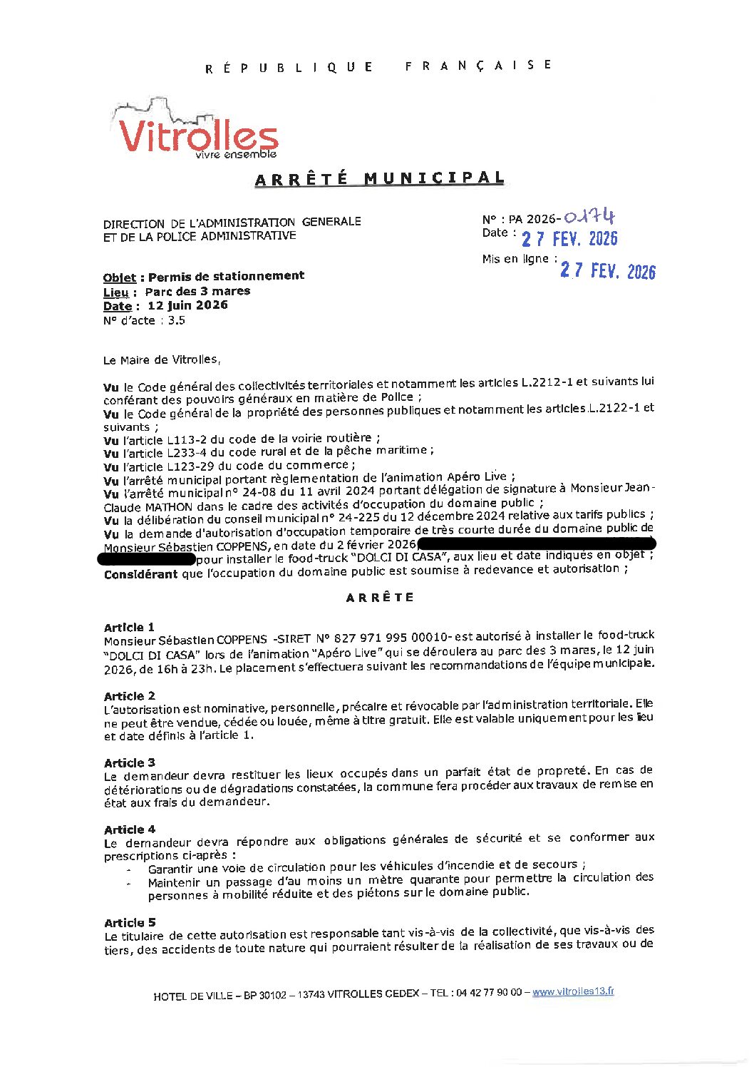 Arrêtés : PA 2026-0174 DOLCI DI CASA Apéro Live – Parc des 3 mares – 12 juin 2026