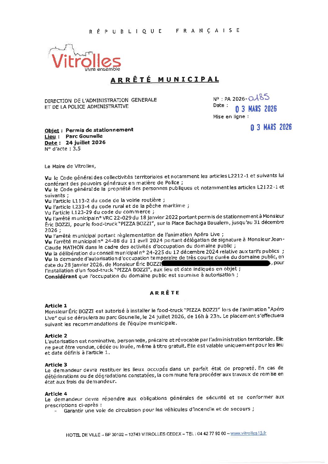 Arrêtés : PA 2026-0185 FT PIZZA BOZZI – Apéro Live – Parc Gounelle – 24 juillet 2026