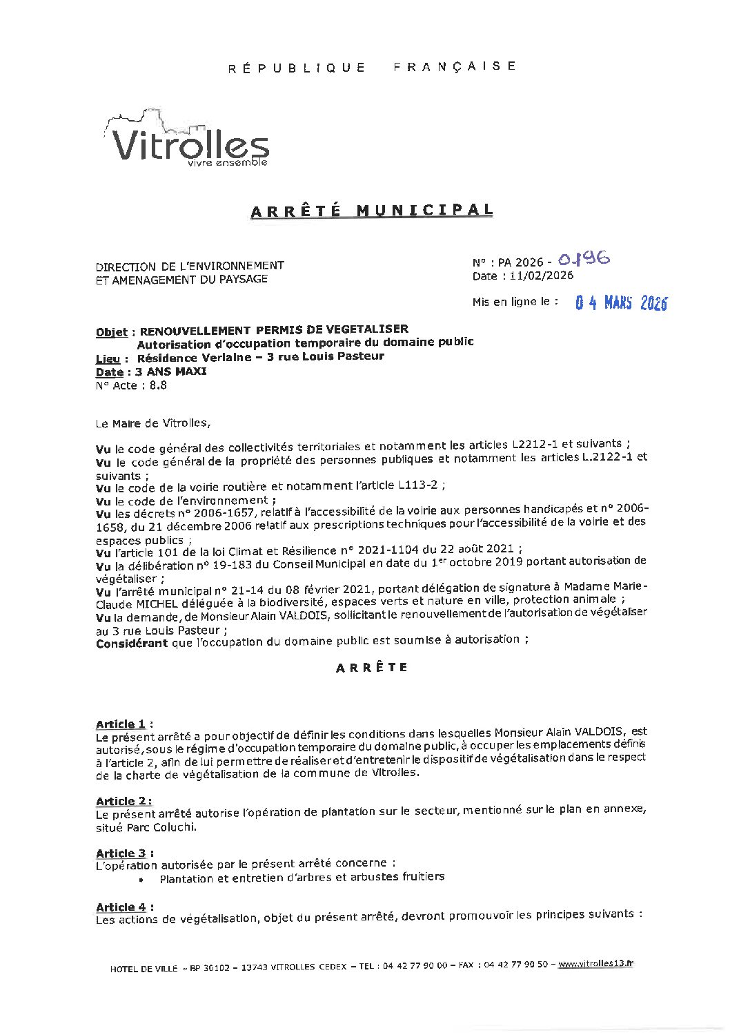 Arrêtés : PA 2026-0196 Renouvellement permis de végétaliser – Résidence Verlaine