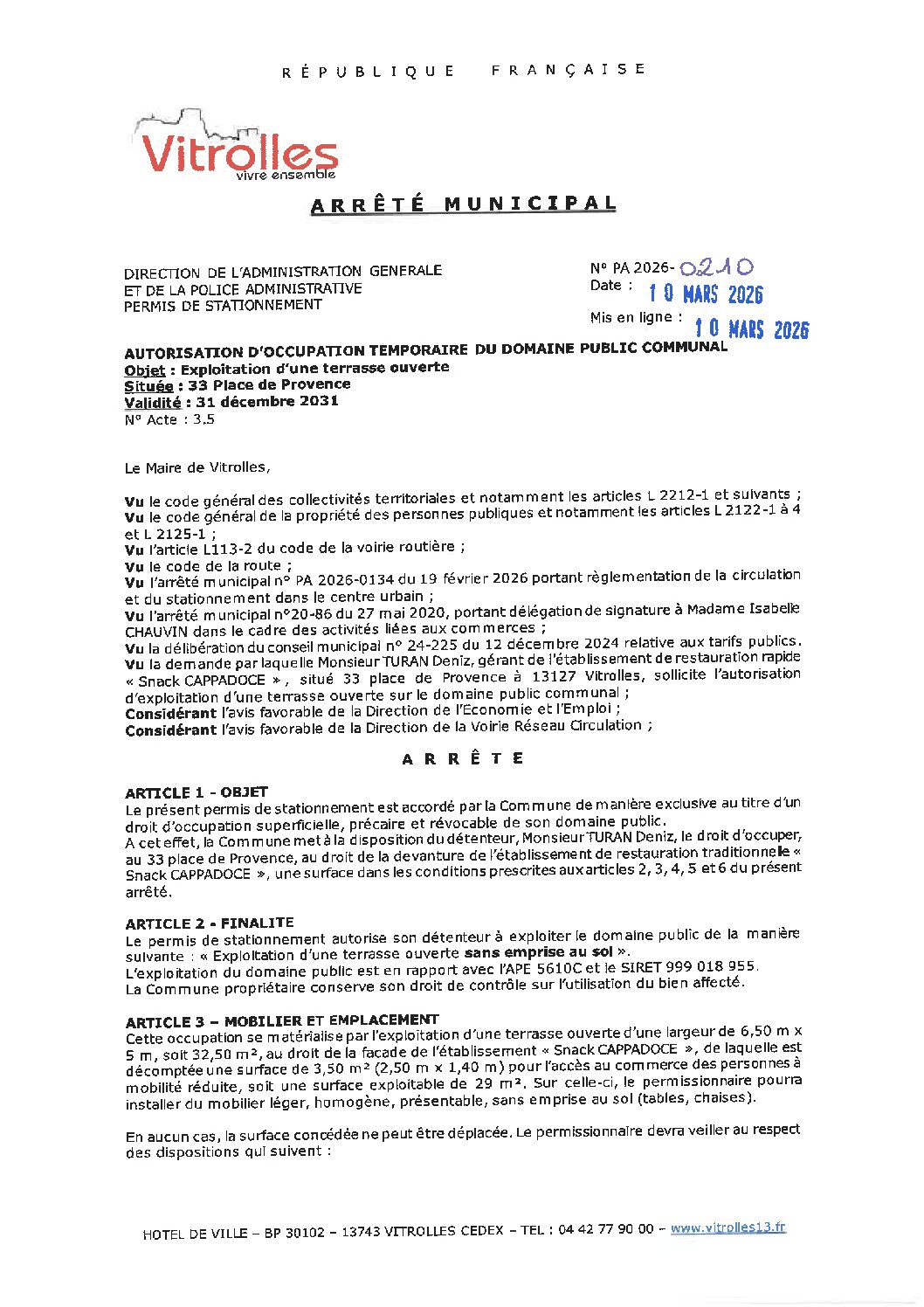 Arrêtés : PA 2026-0210 Exploitation d'une terrasse ouverte – Snack Cappadoce