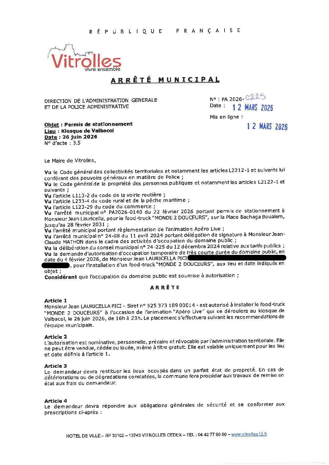 Arrêtés : PA 2026-0225 FT MONDE 2 DOUCEURS – Apéro Live Valbacol – 26 juin 2026