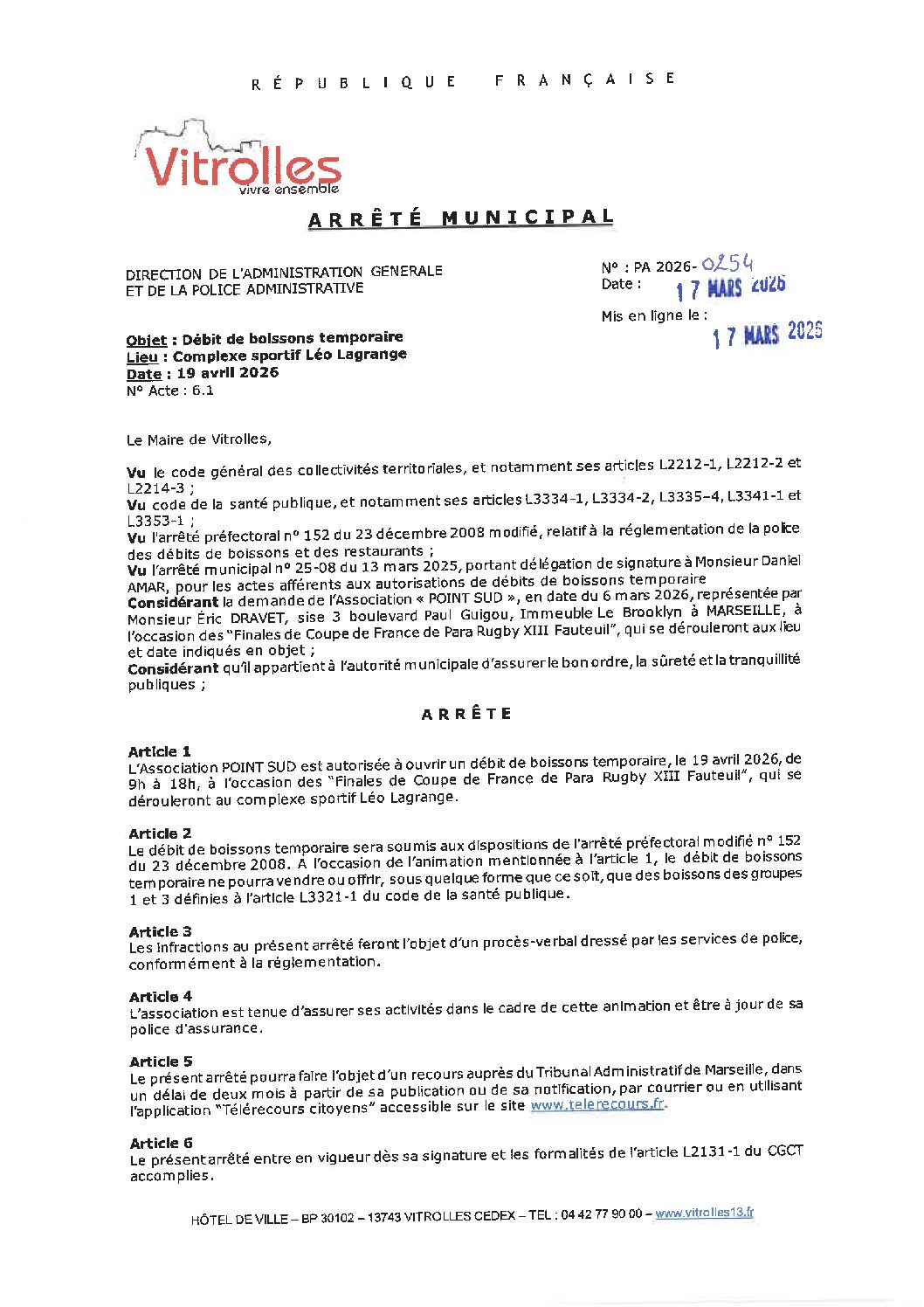 PA 2026-0254 Débit de boissons temporaire pour l'association POINT SUD – “Finales de Coupe de France de Para Rugby XIII Fauteuil”