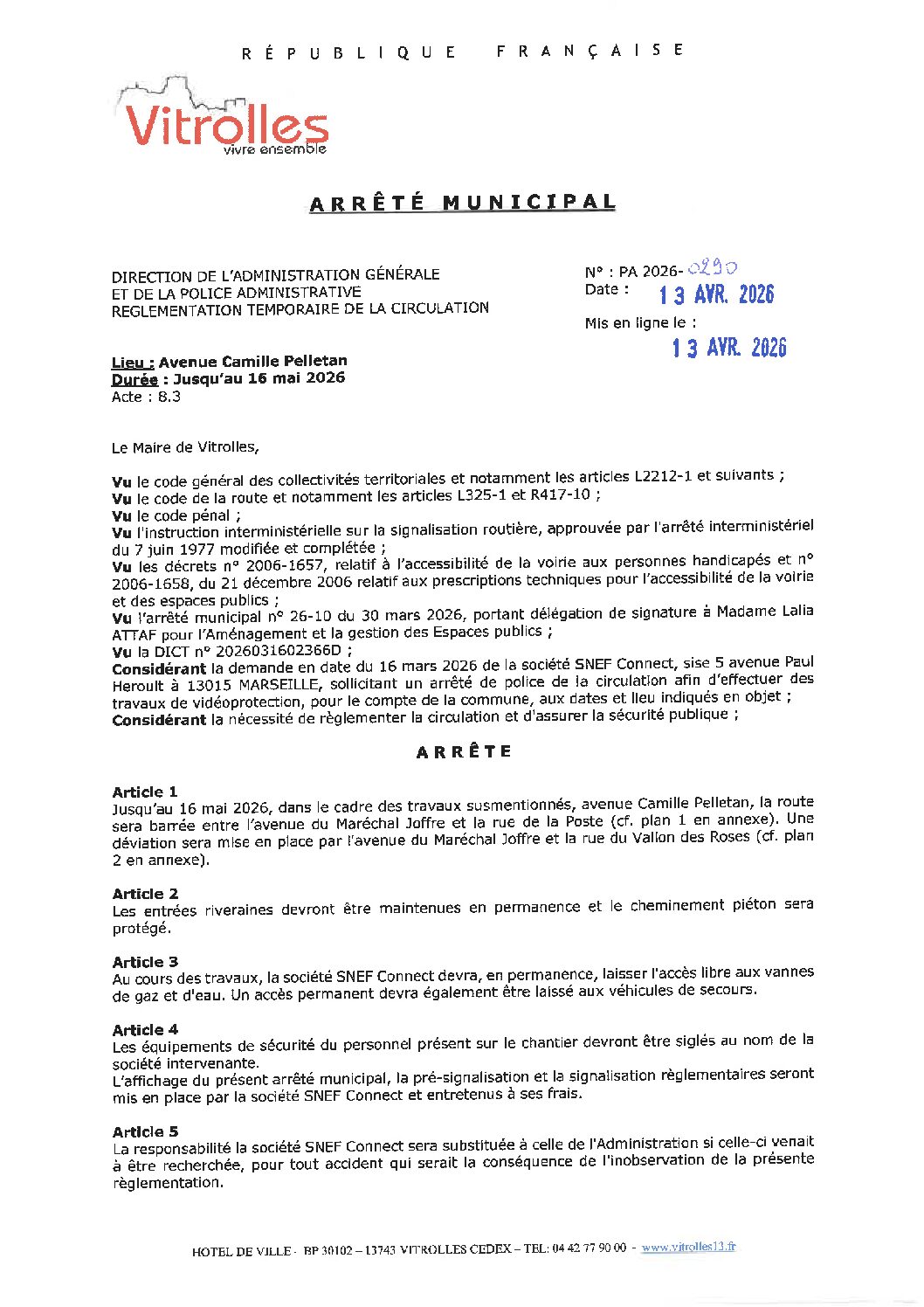 Arrêtés:PA2026-0290Règlementation temporaire de la circulation sur l'avenue Camille Pelletan afin d'effectuer des travaux de Vidéoprotection jusqu'au 16/05/2026