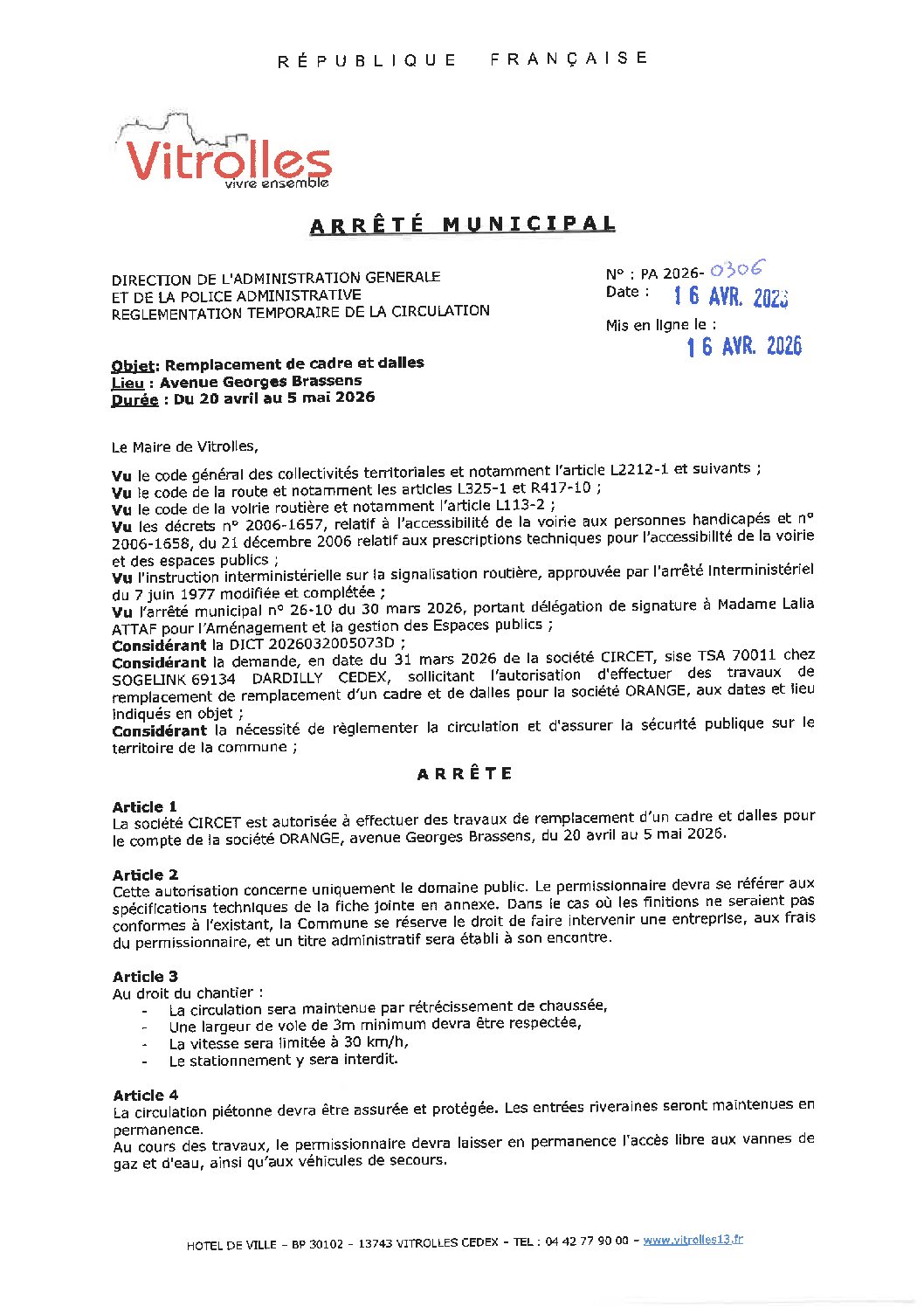 PA 2026-0306 Règlementation temporaire de la circulation – Avenue Georges Brassens