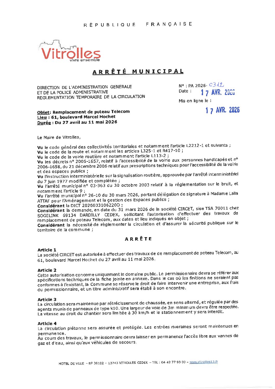 PA2026-0312 Règlementation temporaire de la circulation – 61 Bd Marcel Hochet