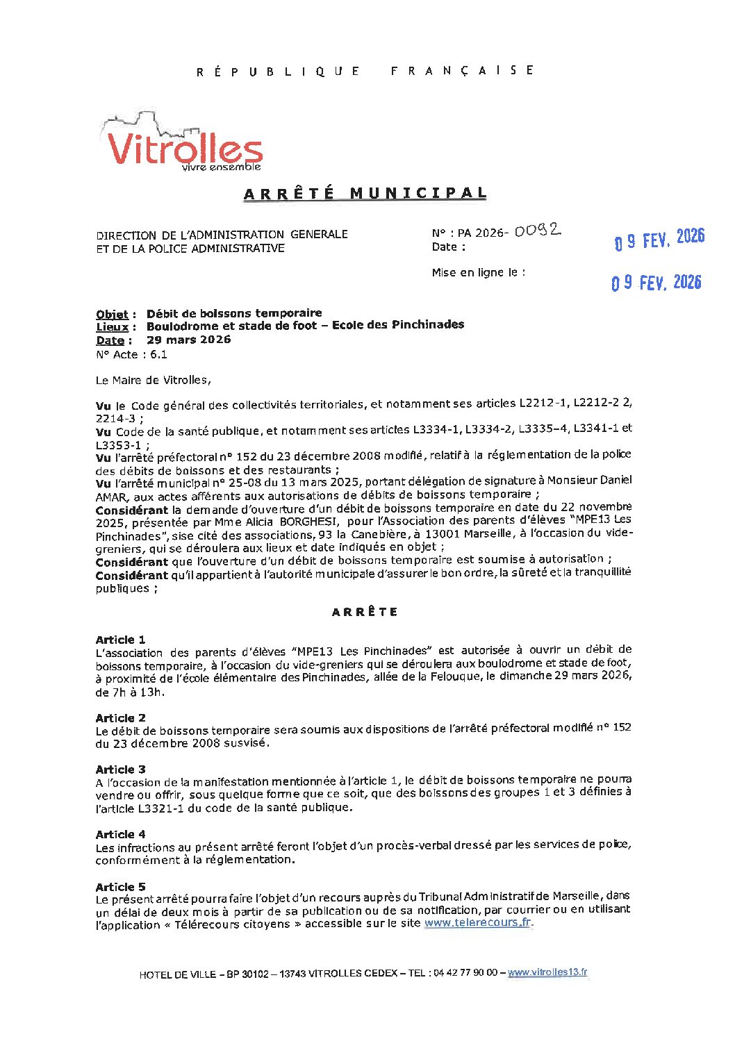 Débit de boissons temporaire vide grenier- Association des parents d'élèves MPE 13 – Ecole des Pinchinades le 29 mars 2026