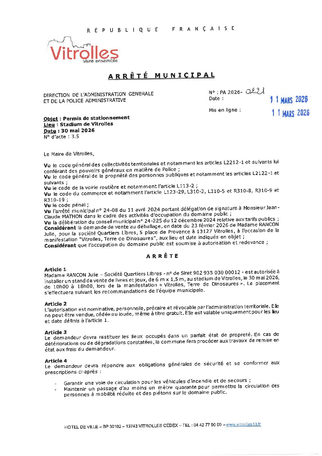 Permis de stationnement étal QUARTIERS LIBRES – Vitrolles terre de dinosaures