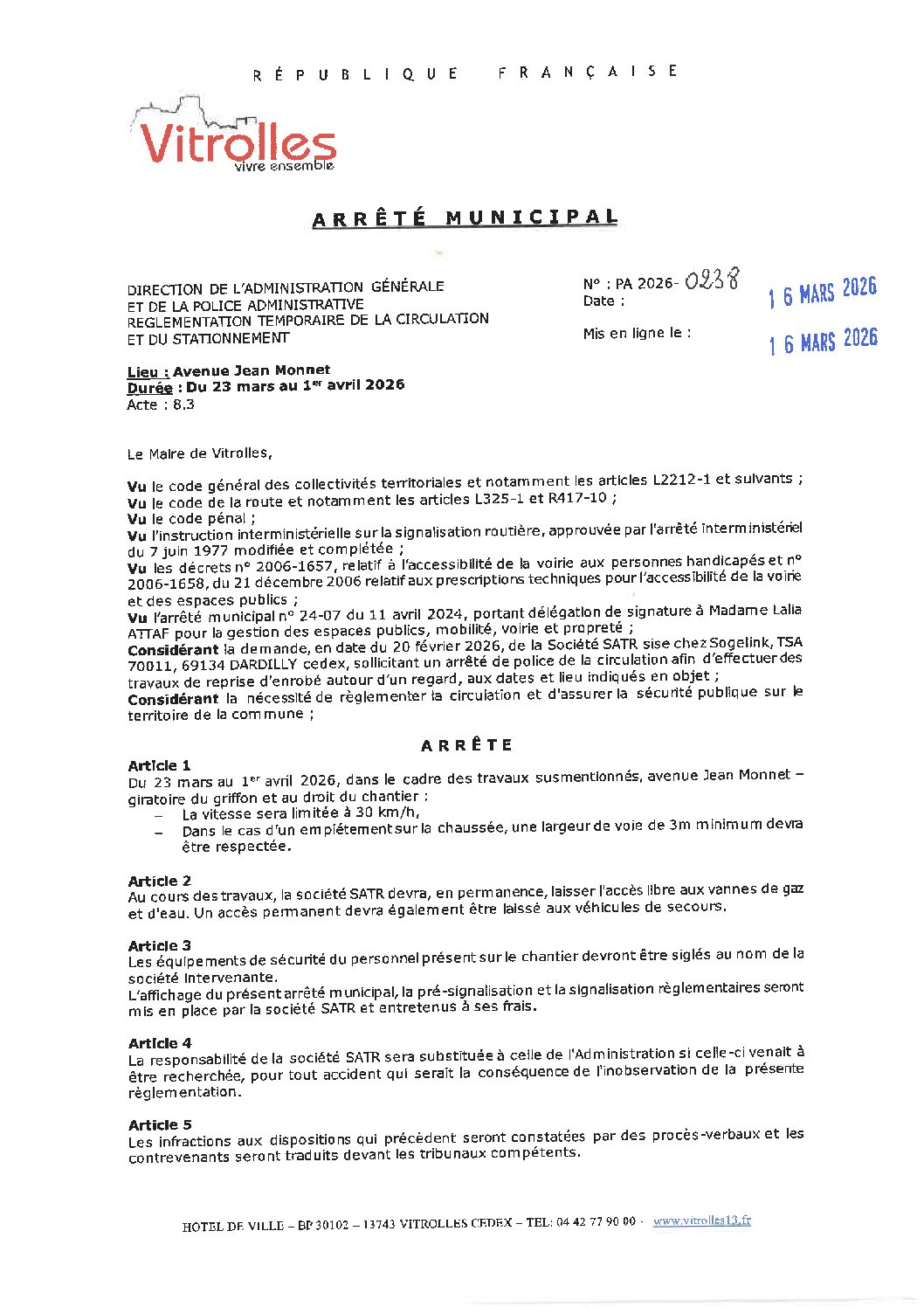 Arrêtés : PA2026-0238 Règlementation de la circulation avenue Jean Monnet
